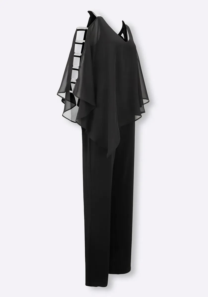 Комбинезон из трикотажной ткани и шифона для праздничного образа. С ювелирными аппликациями и вырезами на руке. Молния сбоку до бедер. 95% полиэстер, 5% эластан. Шифон: 100% полиэстер. Машинная стирка.