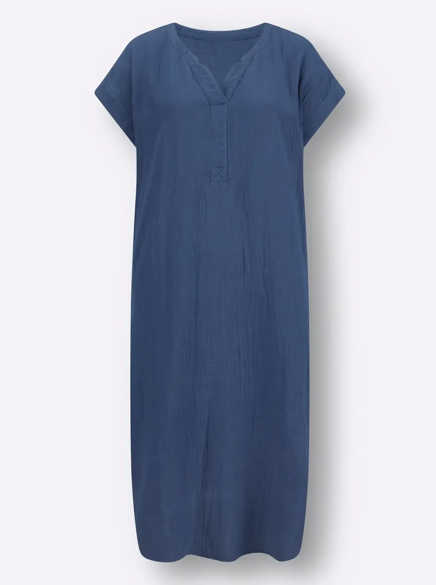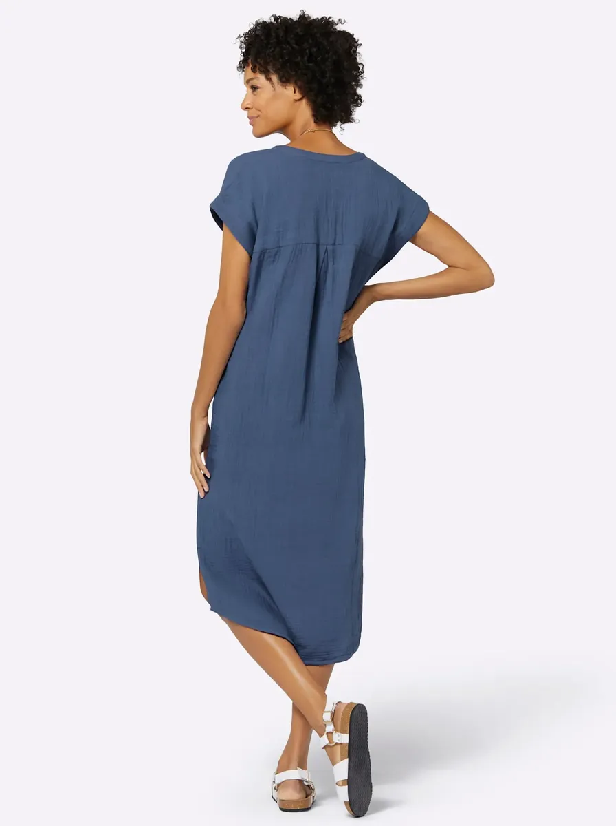 Заходите и испытайте приключения! Платье из воздушного, тонко структурированного муслина с круглым вырезом и V-образным вырезом внахлест. Небрежно завышенные плечи. 2 накладных кармана. Боковые разрезы для большей свободы движений. Подол немного длиннее и слегка закруглен сзади. Поддержите инициативу «Хлопок, сделанный в Африке». 100% хлопок. Машинная стирка.