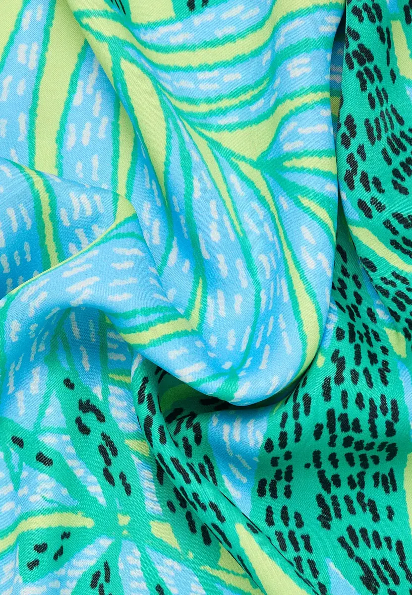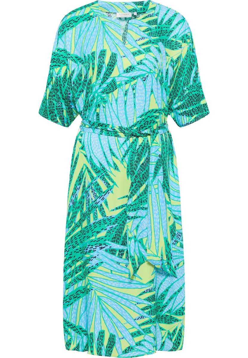 Это платье-блузка излучает современную уверенность в себе благодаря удивительно свежим цветам. Платье из струящейся блестящей вискозы с выразительным принтом в виде пальмовых листьев придаст вашему образу стиль и изысканность. Вискоза мягкая и приятная для кожи, имеет охлаждающий эффект. V-образный вырез придает этому платью с модными рукавами-кимоно игривый и женственный вид. С помощью ремня, который фиксируется шлевками, можно подчеркнуть талию. по вашему желанию и создайте элегантный силуэт. Длина спинки 114 см, слегка свисающий низ. Свободный крой оверсайз мягко струится, создает ощущение воздушности и подчеркивает фигуру. Закажите это платье-блузку онлайн прямо сейчас, потому что это безопасный выбор. на любой модный случай и легко интегрируется во многие наряды.