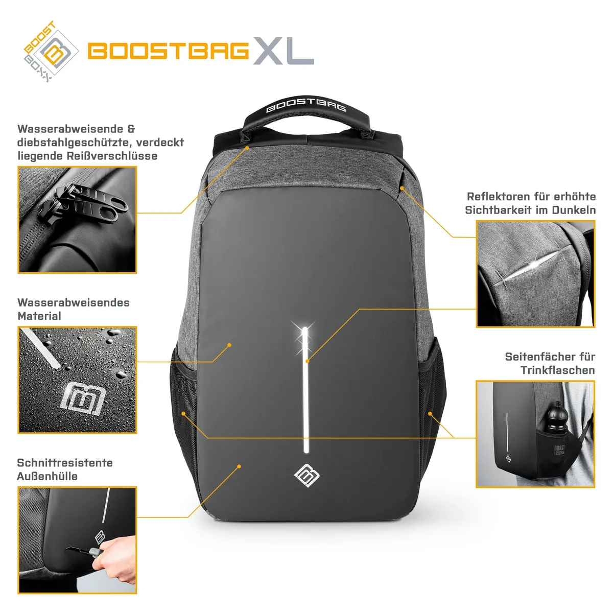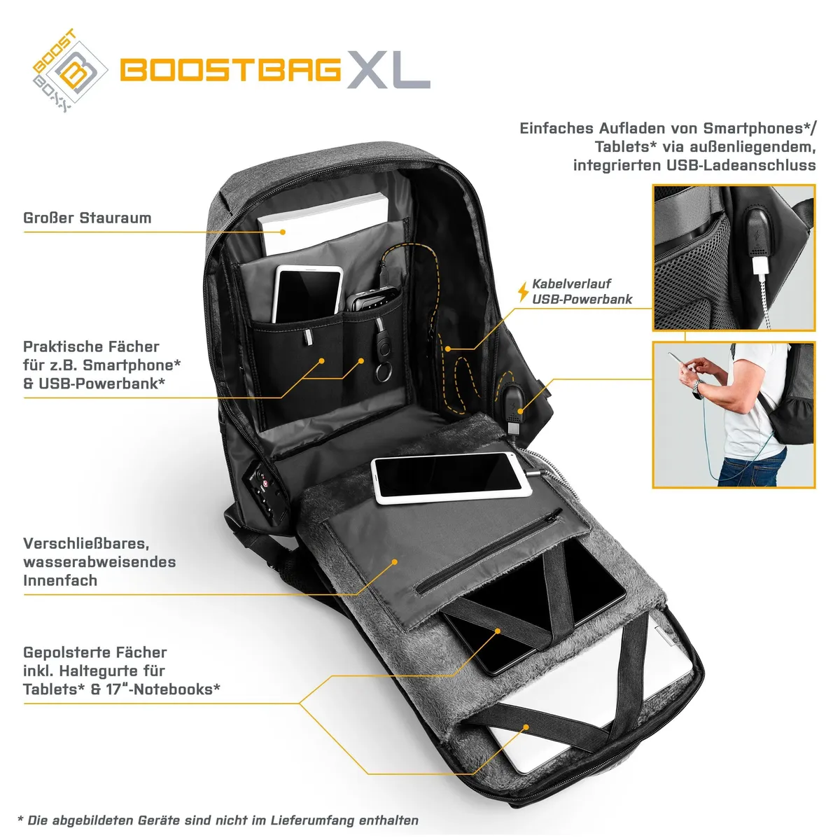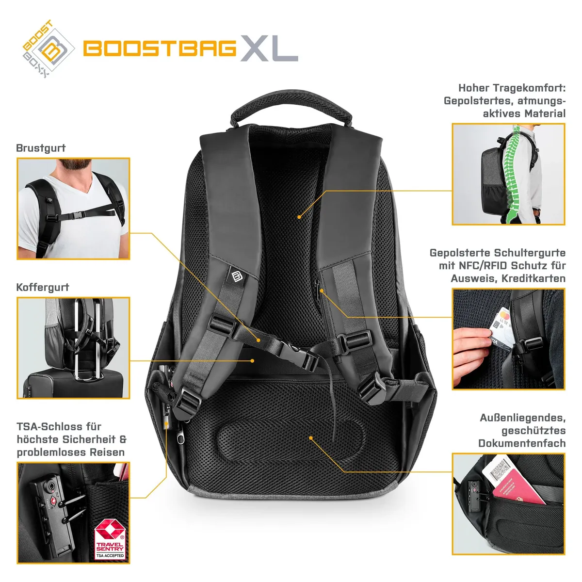 BoostBag — это высококачественный рюкзак с защитой от краж, который идеально подходит для путешествий, учебы, учебы и работы! Когда вы в пути, этот рюкзак с защитой от кражи обеспечивает оптимальную защиту вашего ноутбука, планшета, документов и ценностей. Примечание. Ключ TSA имеется только в органах власти, поэтому он не входит в комплект поставки.
