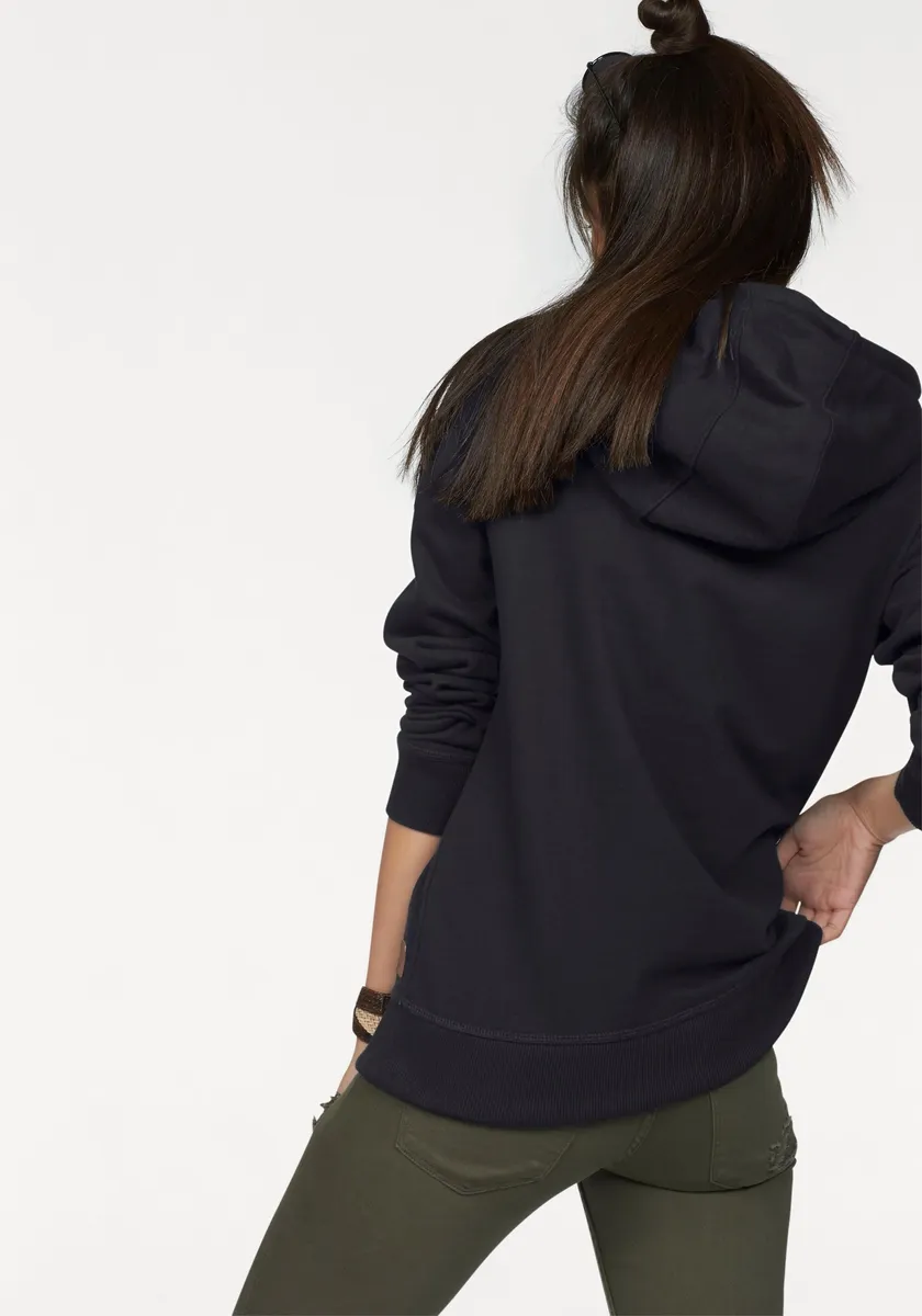 Комбинированная женская толстовка с капюшоном от Ocean Sportswear. Длина до бедра и эластичный крой. Рукава длинные. Модель украшена модным принтом с логотипом. Верх мягкий на ощупь благодаря эластичной потовой ткани.