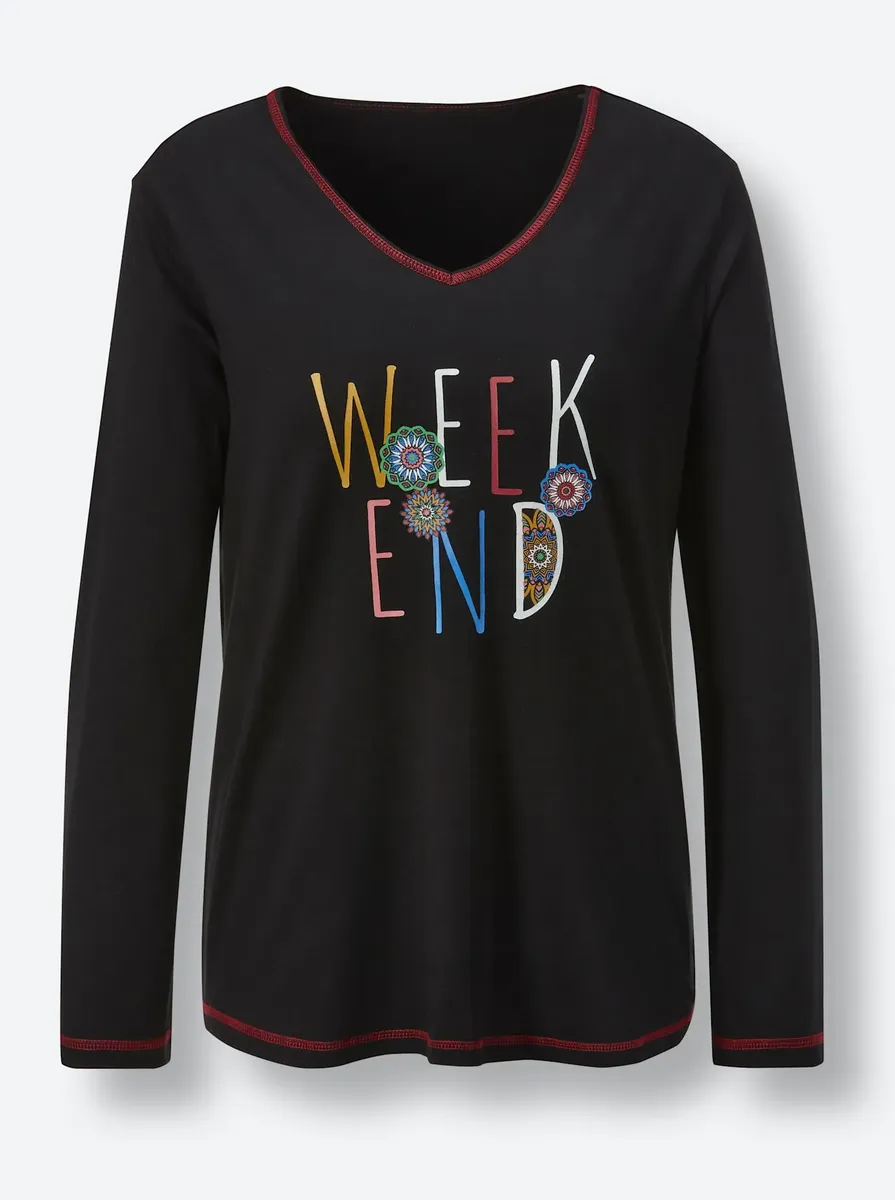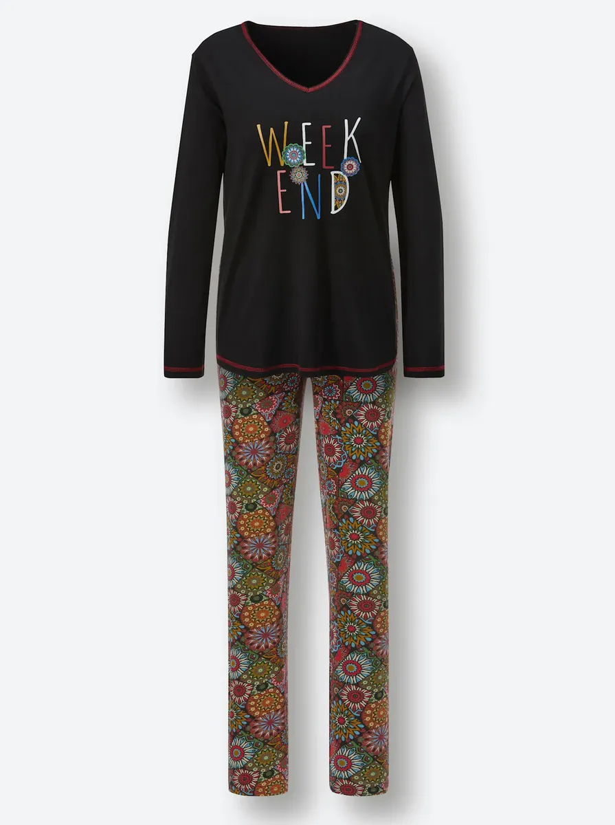 Это сразу поднимет вам настроение! Пижама из приятного мягкого трикотажа. Верх украшен надписью Weekend. V-образный вырез, декоративные швы и слегка закругленный низ. Брюки с принтом и широким эластичным поясом. 50% хлопок, 50% модал.