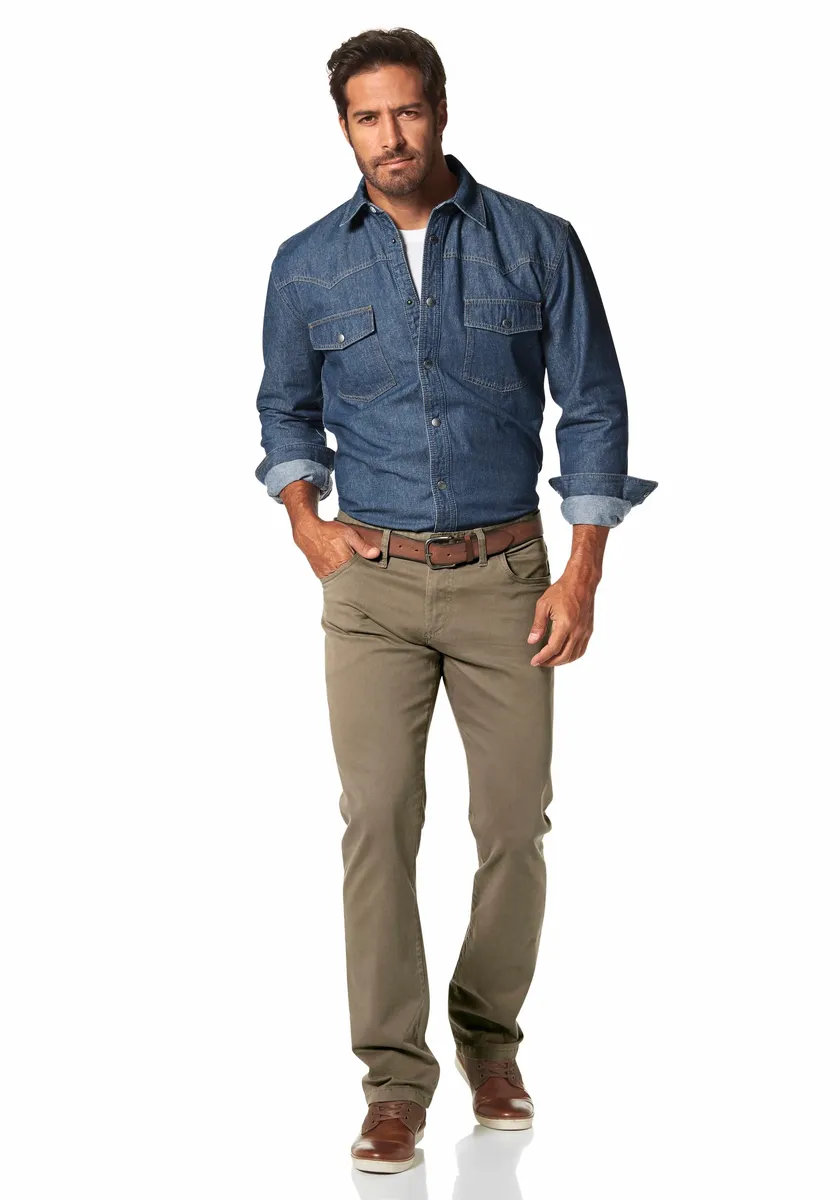 Комбинированная мужская рубашка из плотного денима из Аризоны. С обычным широким вырезом. Рукава на пуговицах длинные. Верх прочный благодаря прочному джинсовому материалу.
