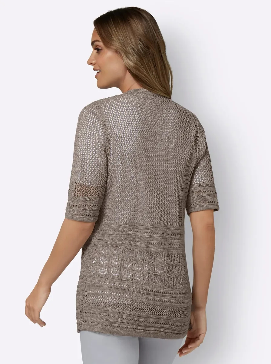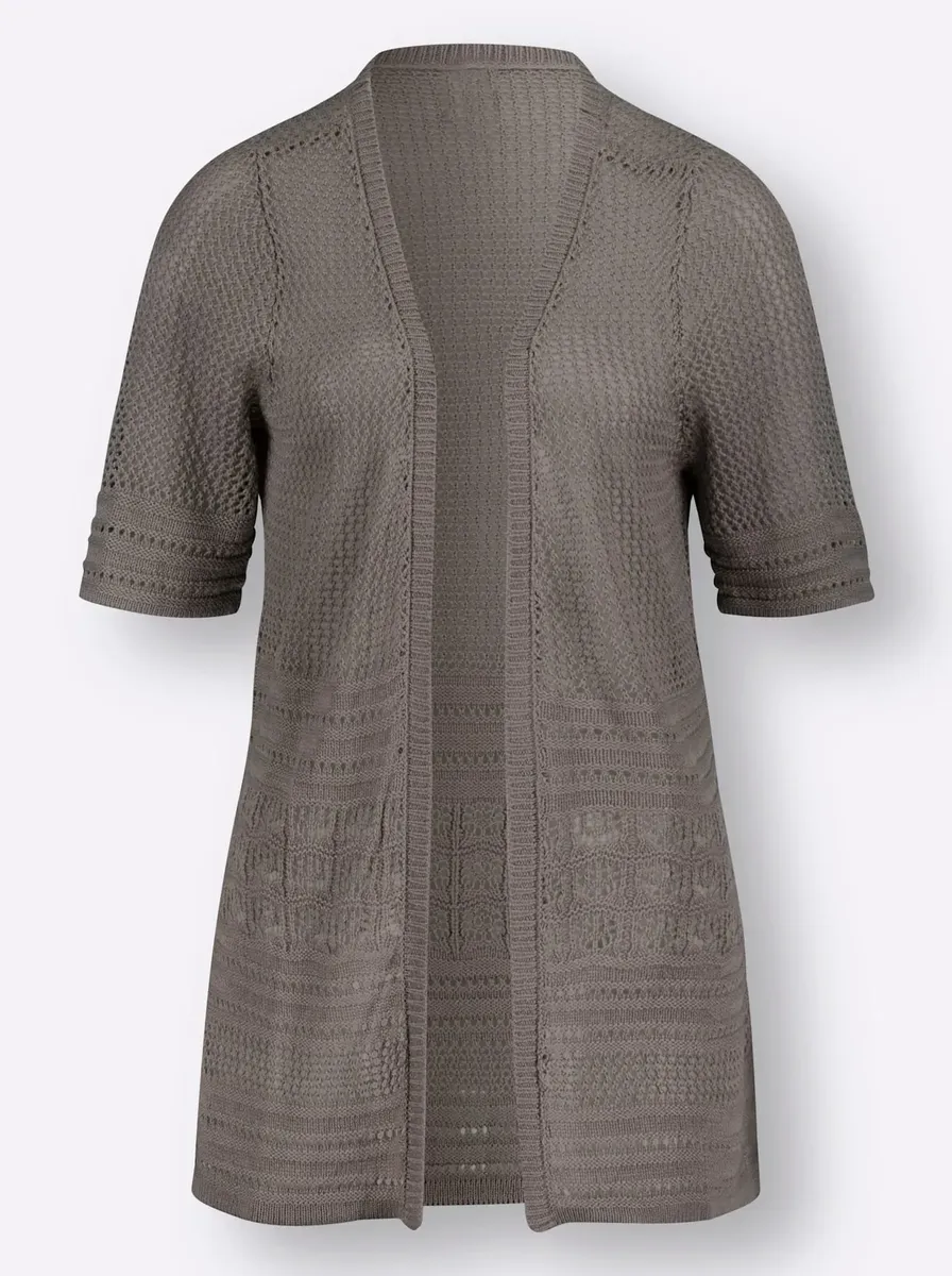 В воздушном узоре Ajour по всей поверхности: летний кардиган модного открытого кроя с короткими рукавами. 100% полиакрил. Машинная стирка.