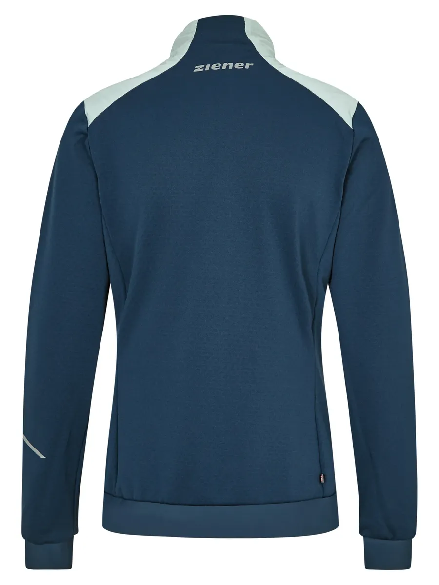 Функциональная, облегающая женская гибридная куртка ZIENER NARINA LADY с ZIENER WEATHERSHIELD обеспечивает хорошую функциональность и защиту благодаря водо- и ветроотталкивающим материалам - независимо от того, идет ли легкий дождь, ветер или снег. Он имеет мягкую верхнюю переднюю часть из утеплителя PrimaLoft (набивка 40 г/м²). Набивка изготовлена ​​из переработанного материала – для ресурсосберегающего подхода к окружающей среде. Дышащий эластичный материал на спине и нижней части переда обеспечивает максимальную свободу движений. Благодаря экологически чистой пропитке куртка не содержит ПФУ. Дополнительные технические детали делают куртку верным спутником в спортивных приключениях: воротник-стойка защищает шею от ветра и непогоды. Два боковых кармана на молнии гарантируют надежное хранение мелких предметов. Эластичный низ обеспечивает идеальную посадку, а светоотражающие элементы повышают видимость. Куртка идеально подходит для занятий спортом с интенсивным движением, где требуется максимальная воздухопроницаемость!
