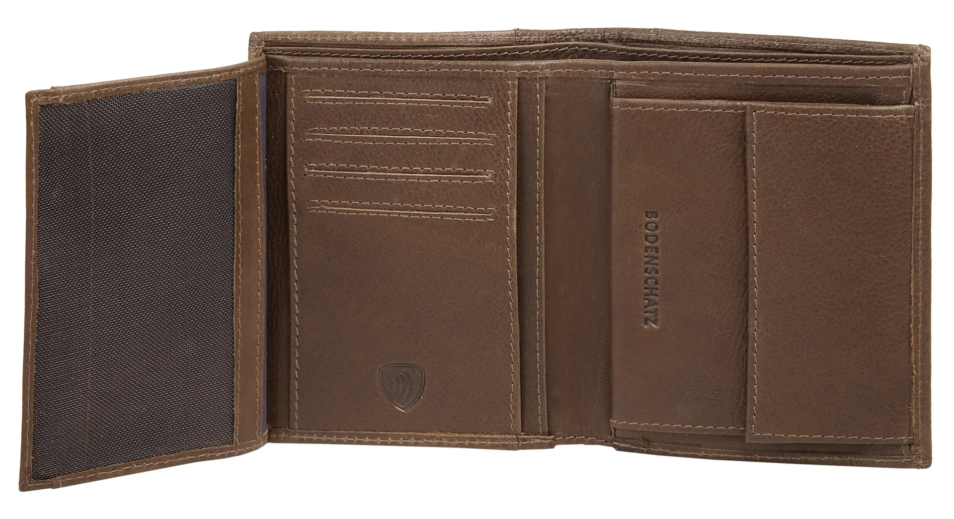 Этот вневременной кожаный кошелек Bodenschatz портретного формата вас порадует! Тонкий дизайн облегчает обращение и не занимает много места в сумке. Тем не менее, у вас достаточно места для банковских карт и наличных, поэтому все необходимое у вас всегда будет с собой. Чрезвычайно практично: съемная часть превращается в отдельный футляр для карт. И не волнуйтесь: встроенная защита RFID надежно блокирует нежелательное сканирование кредитных и дебетовых карт. * 100% воловья кожа* неподвластный времени кошелек * RFID-защита от несанкционированного использования данных посредством сканирования* 1 отделение для монет с кнопкой* 2 отделения для купюр* 7 отделений для карт * 7 накладных карманов* съемная часть становится футляром для карт* Тиснение логотипа спереди* классический & шикарные особенности: натуральная кожаДополнение к названию: натуральная кожаШирина: 13,5 смВес: 120Высота: 10 смГлубина: 2 смКоличество внутренних карманов: 7Количество отделений для карточек: 7Количество отделений для купюр: 2Количество видимых карманов: 1Внешний материал: 100% воловья кожаРазмер: onesizeОсновная застежка: Без застежкаЦвет салона: синийВнутренний материал: СинтетикаВес: 120 гОтделение для монет: есть (кнопка)Вид поверхности: монохромный - матовыйОбъем: 0,1Формат: альбомный формат
