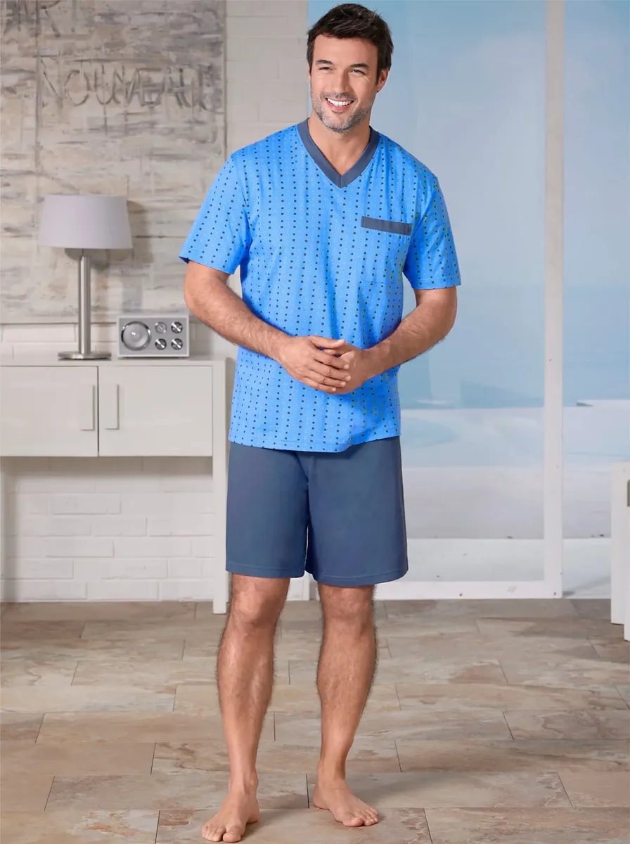 В доступной двойной упаковке: шорты с тонким верхом с принтом. Однотонные брюки с V-образным вырезом, планкой на нагрудном кармане и эластичным поясом. Качество одиночного трикотажа. 100% хлопок.