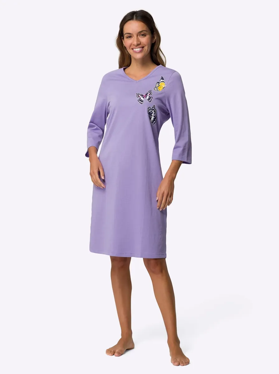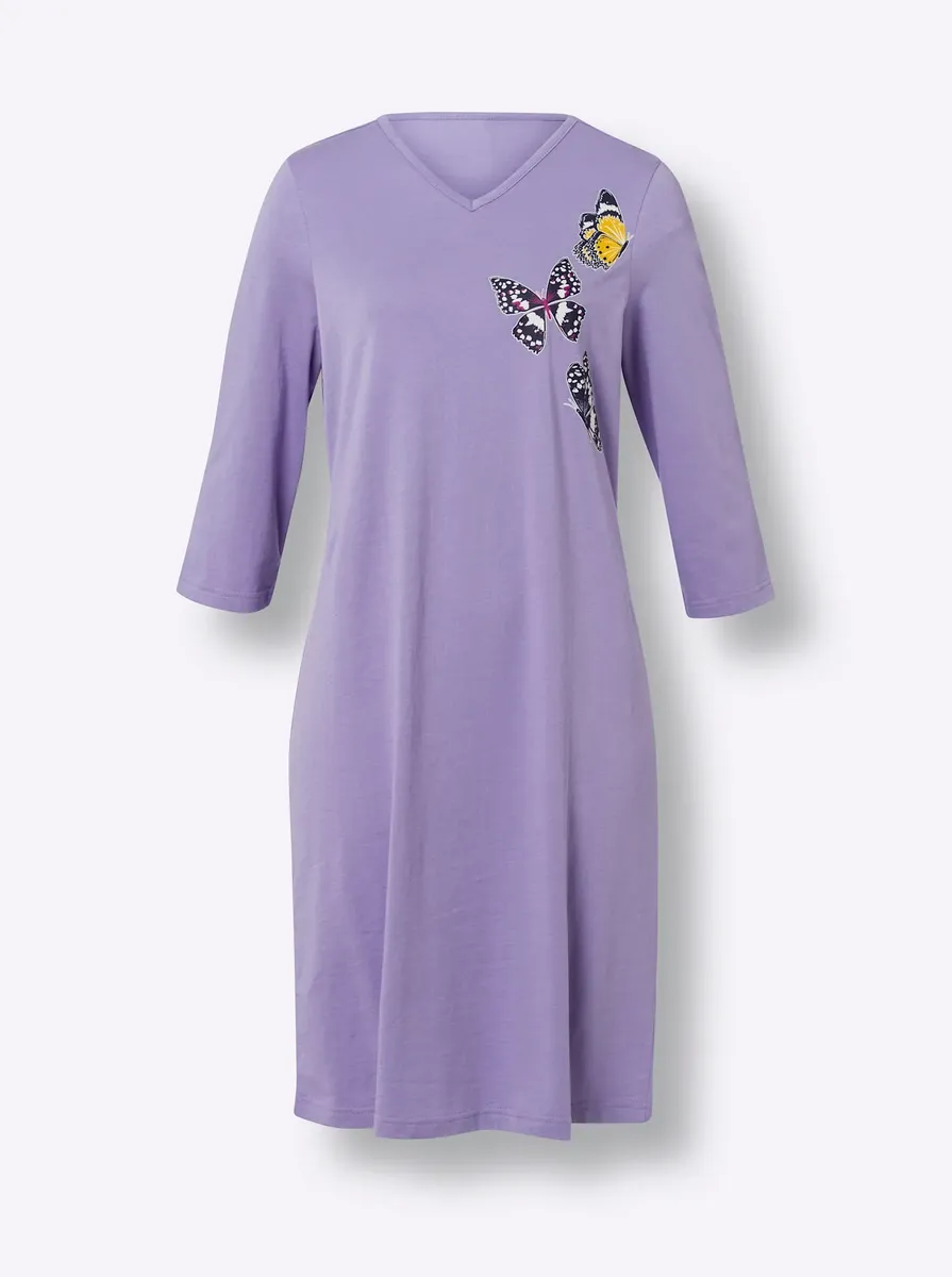 В животе бегают бабочки: красивая ночная рубашка с рельефным принтом. В практичной двойной упаковке. V-образный вырез с окантовкой и рукава 3/4. Одинарный трикотаж. 100% хлопок. Машинная стирка.