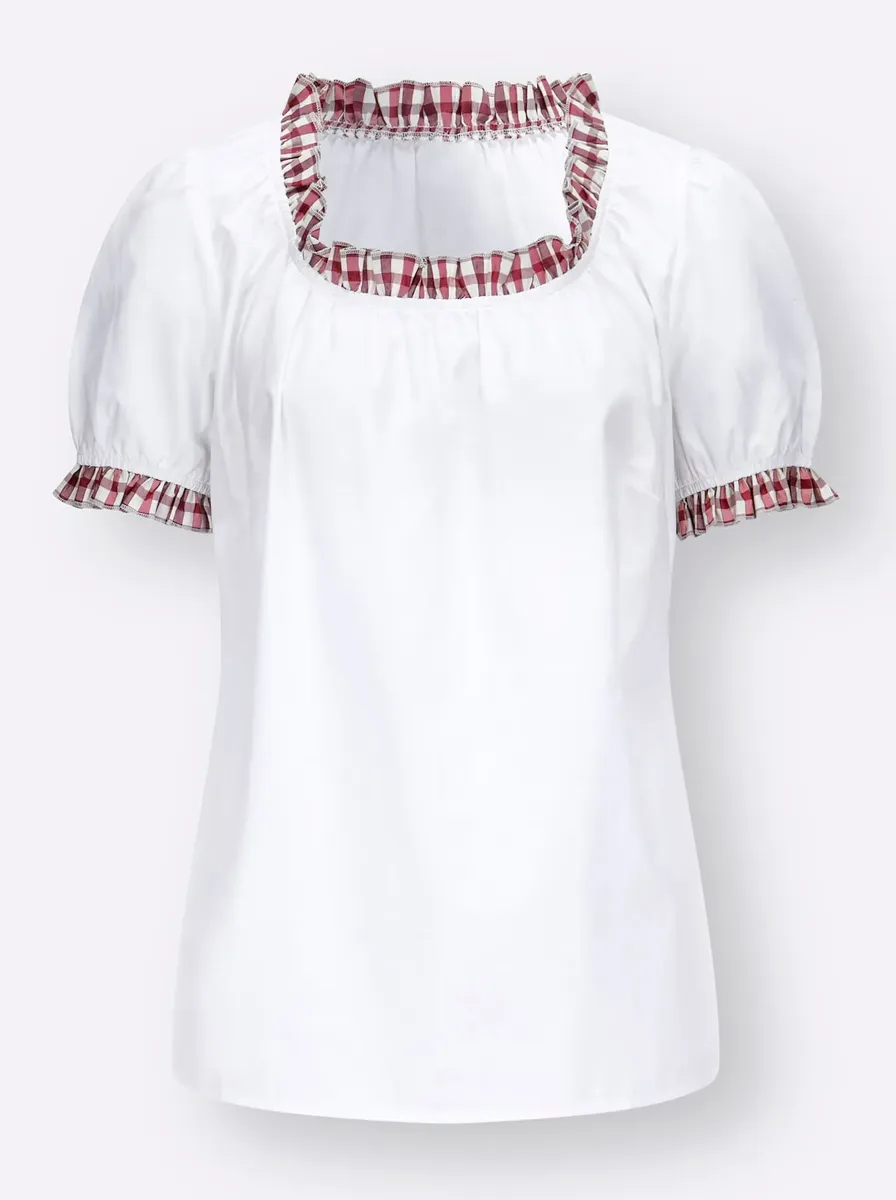 Детализированная блузка с клетчатыми рюшами вокруг выреза и рукавами-фонариками. 65% полиэстер, 35% хлопок. Отделка: 65% полиэстер, 35% хлопок. Машинная стирка.