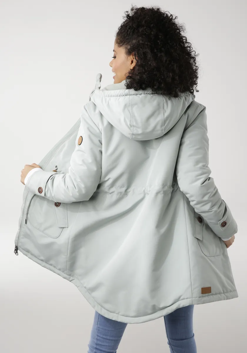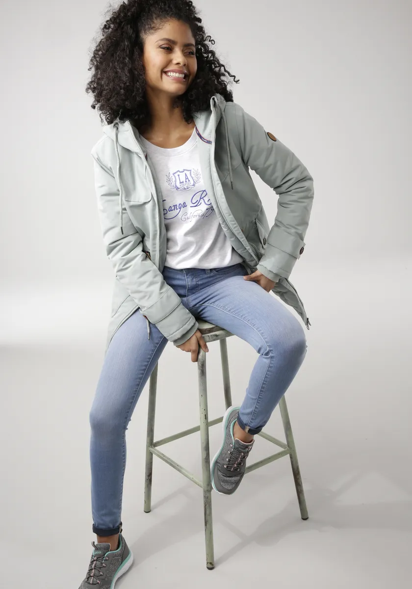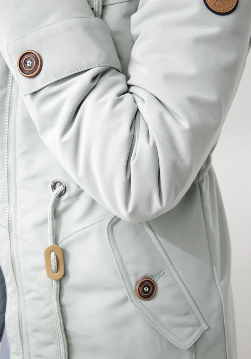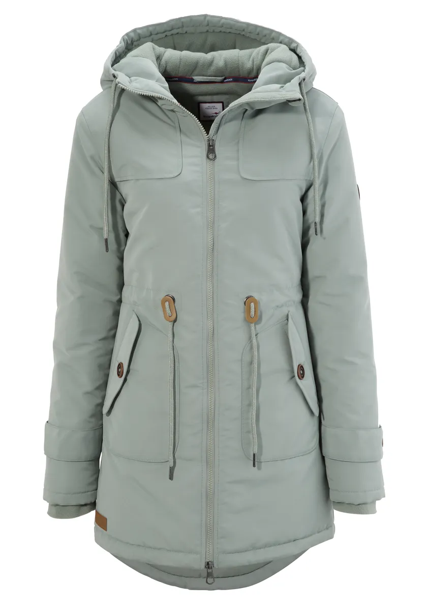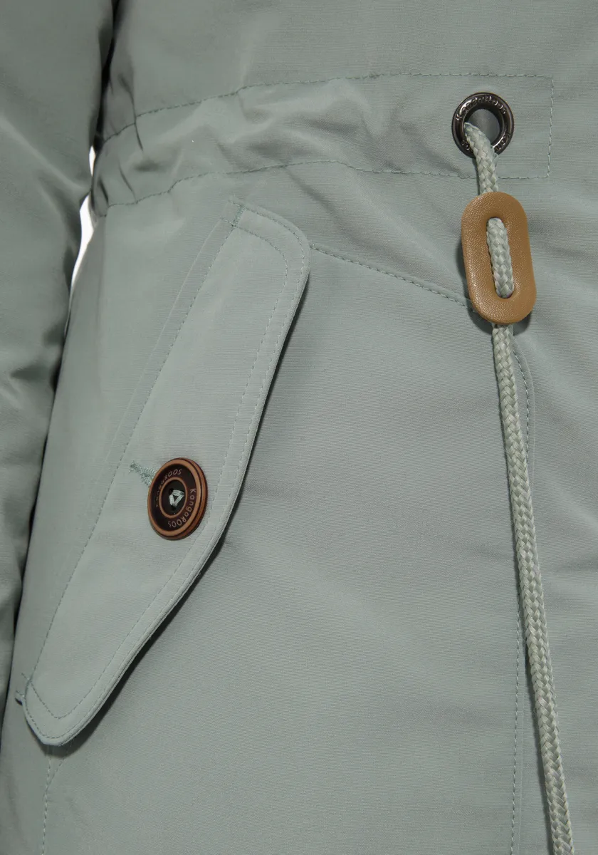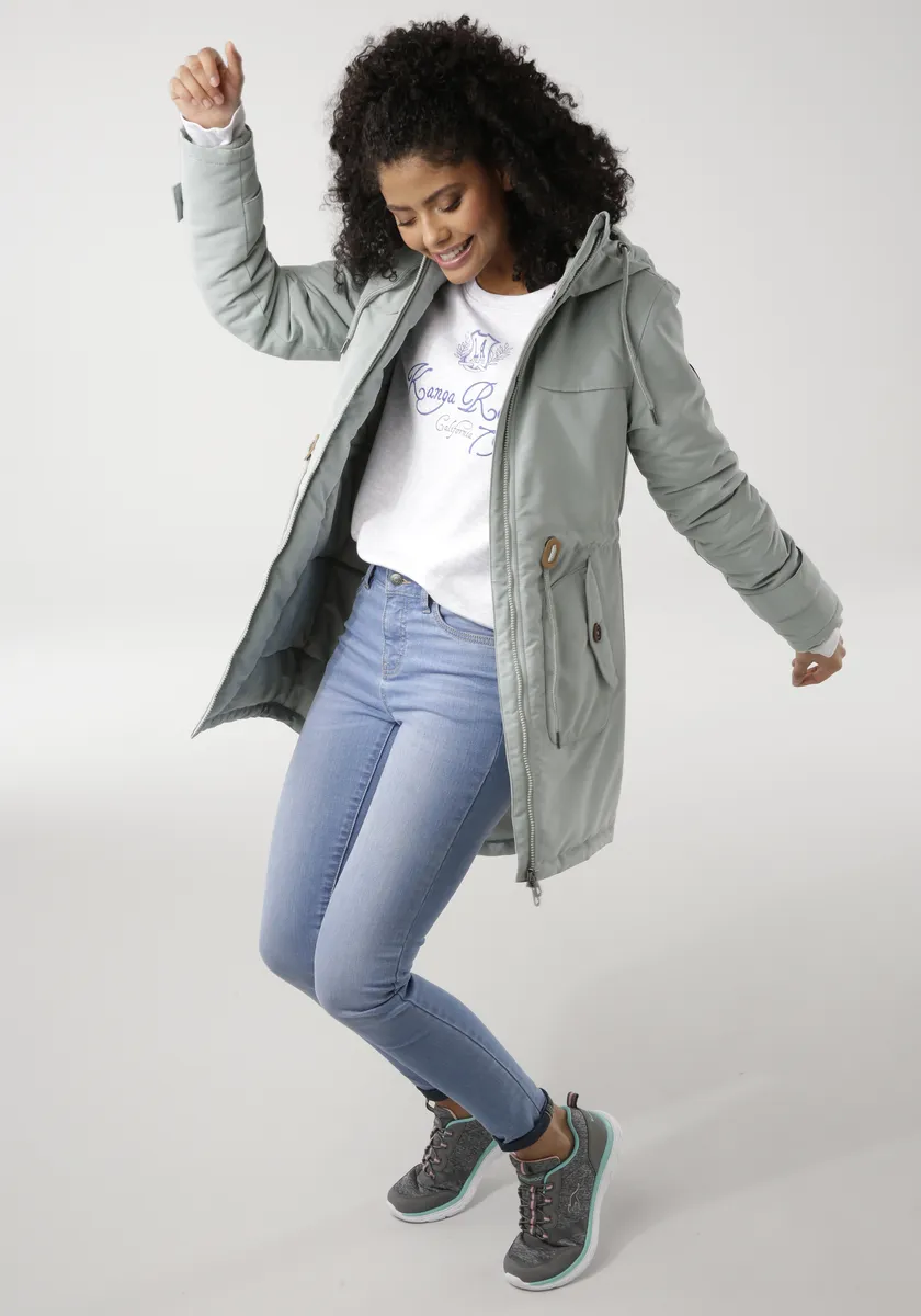 Зимняя парка с высокой посадкой для холодных дней от KangaROOS. Водоотталкивающая внешняя ткань, теплая подкладка, уютная флисовая подкладка в области капюшона и тела. Облегает фигуру, талия с внешней кулиской для регулировки ширины. Функциональные карманы для рук + внутренний карман на молнии. С флисовыми манжетами, сзади немного длиннее, с закругленным краем.