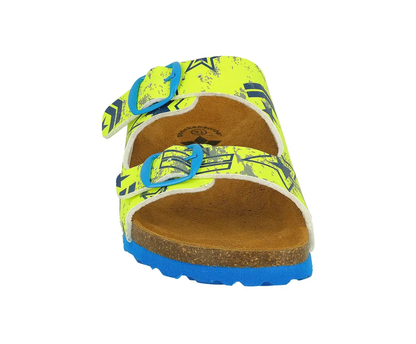Детские сабо из синтетического материала, с регулируемыми пряжками, кожаной стелькой и амортизирующей подошвой из ЭВА. Стелька: пробка/резина.