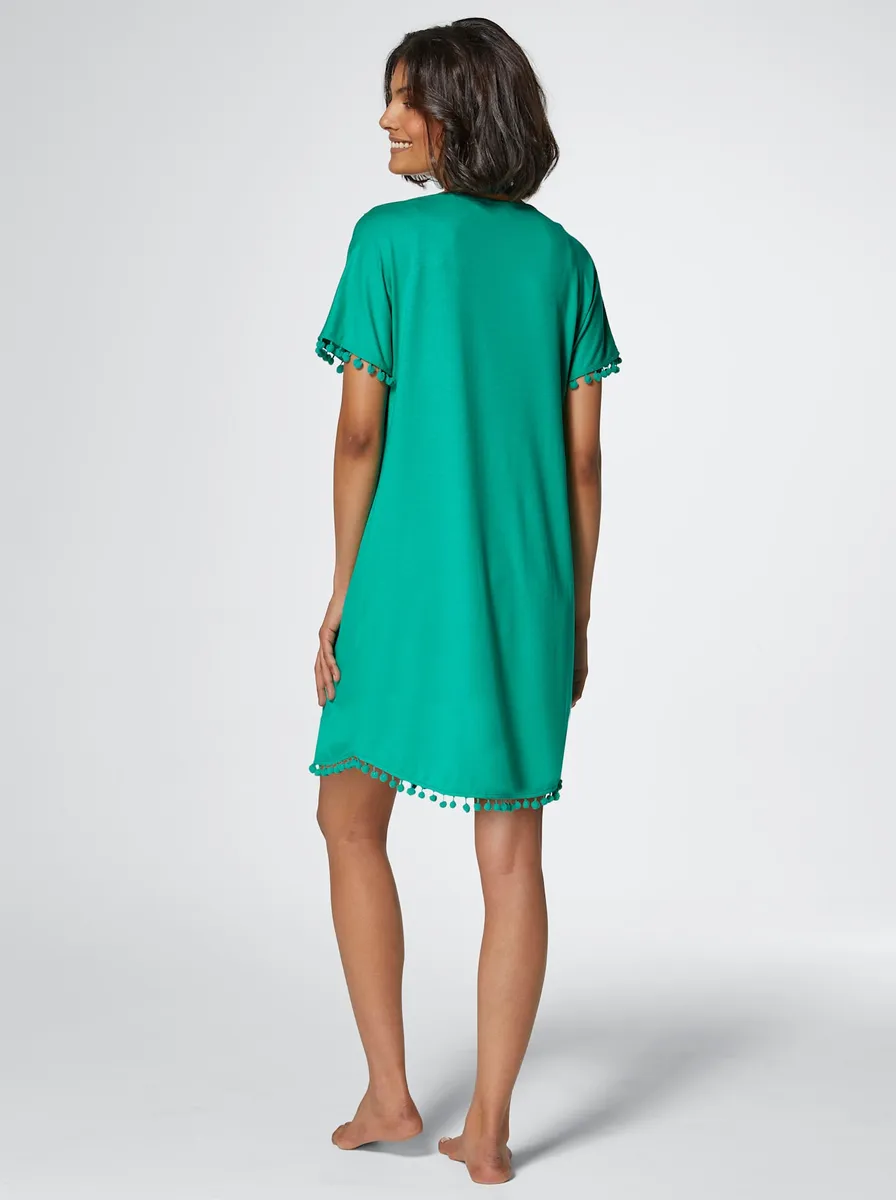 Игривая туника из воздушного трикотажа. V-образный вырез украшен красивым кружевом, а манжеты - забавными помпонами. Это красиво смотрится благодаря повседневному крою. 95% вискоза, 5% эластан.