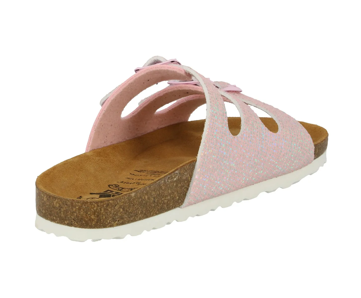 Детские тапочки из синтетического материала, регулируемые пряжки, кожаная стелька, амортизирующая подошва из ЭВА и стелька: пробка/резина.