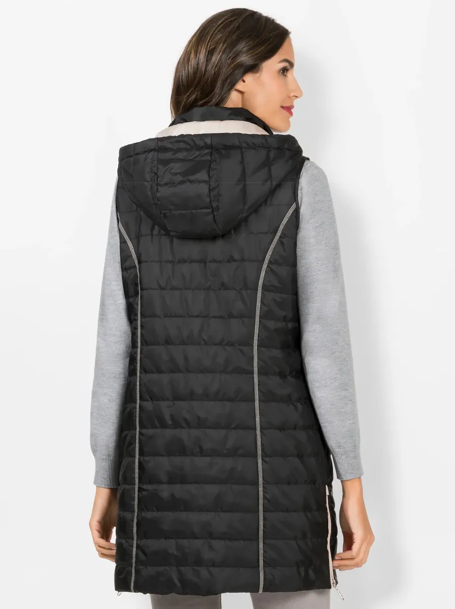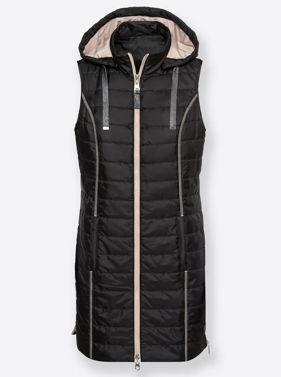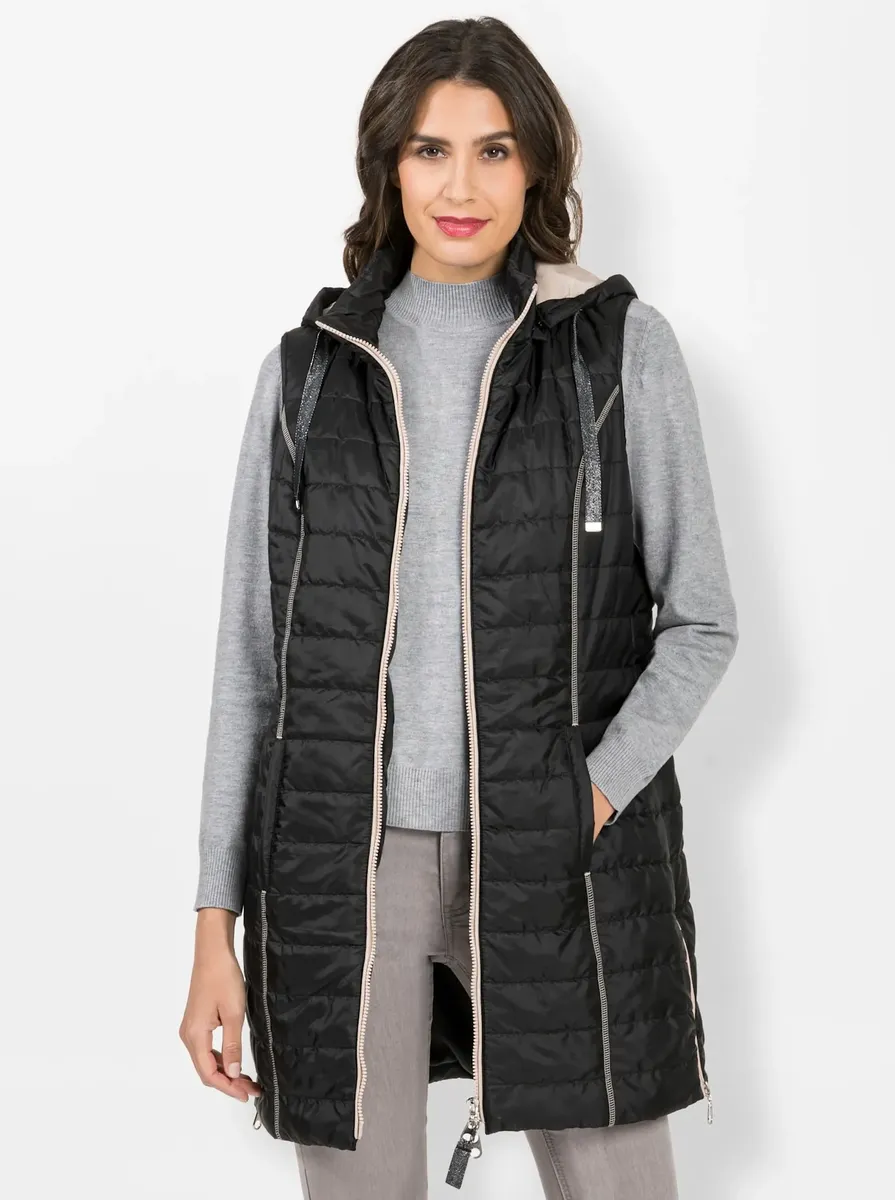Этот модный длинный жилет с легкой подкладкой и спортивной стежкой обязательно придет к вам. Съемный капюшон декорирован мерцающей завязкой. С подкладкой контрастного цвета. С воротником-стойкой, 2 врезными карманами и практичным внутренним карманом. Двусторонняя молния во всю длину и проймы отделаны окантовкой. Венские швы для оптимальной посадки. Две боковые молнии на подоле обеспечивают свободу движений. 100% полиэстер. Подкладка: 100% полиэстер. Машинная стирка.