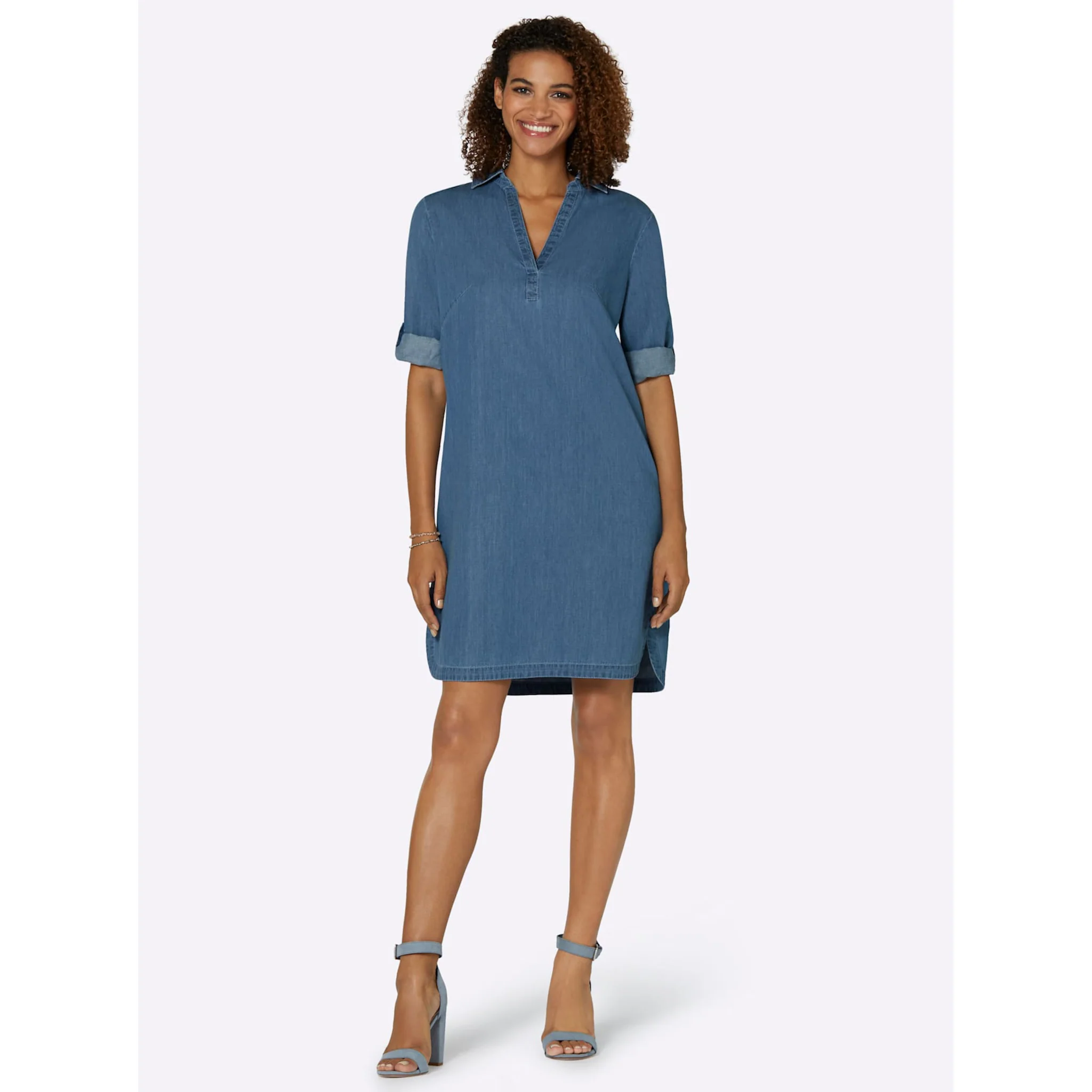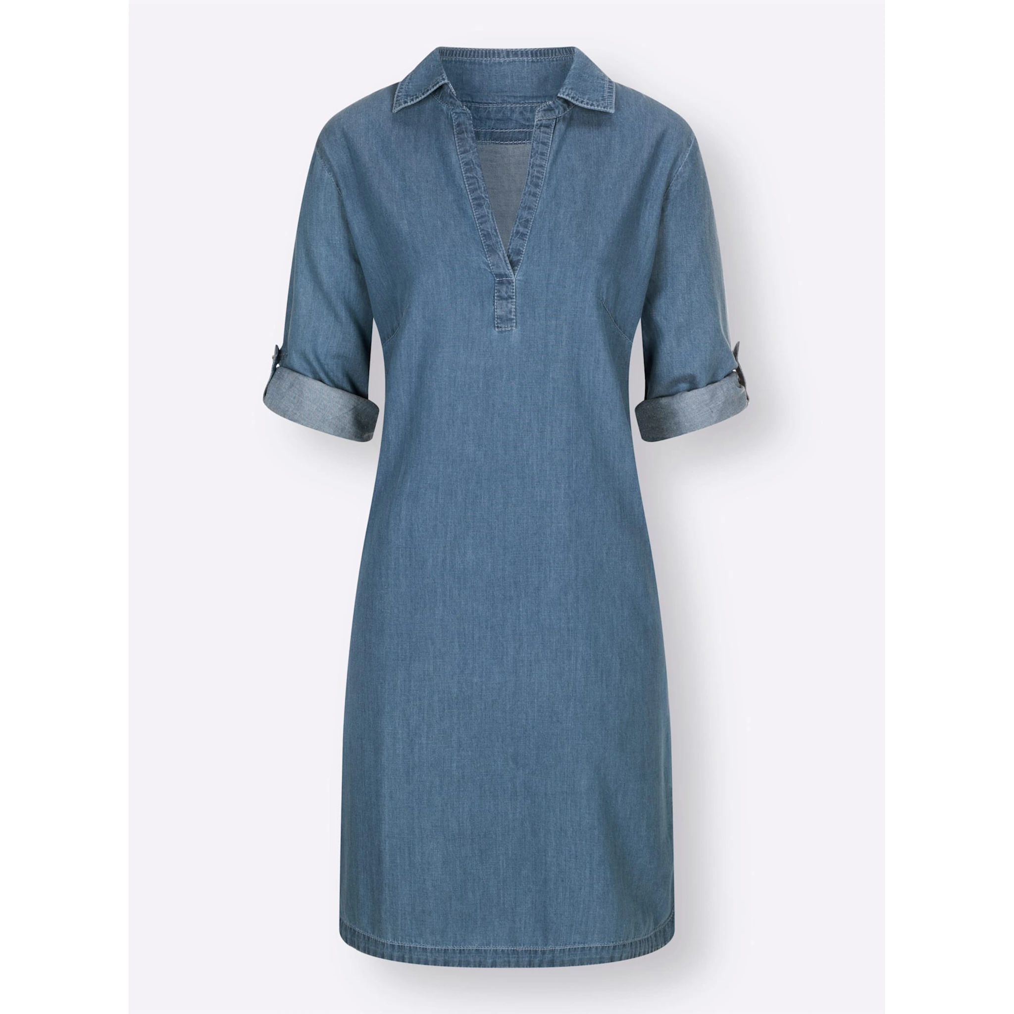 Джинсовое платье в стиле casual и спортивного шика. Модель без застежек с рубашечным воротником, вытачками на груди и V-образным вырезом. Рукава длиной 3/4 также можно подвернуть и закрепить перекладиной и разрезом. Слегка закругленные боковые разрезы. Складка сзади обеспечивает большую ширину. 100% хлопок. Машинная стирка.
