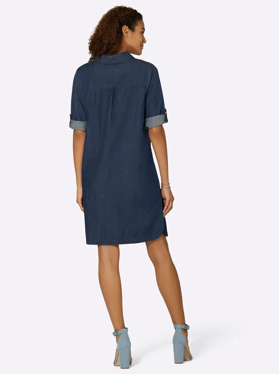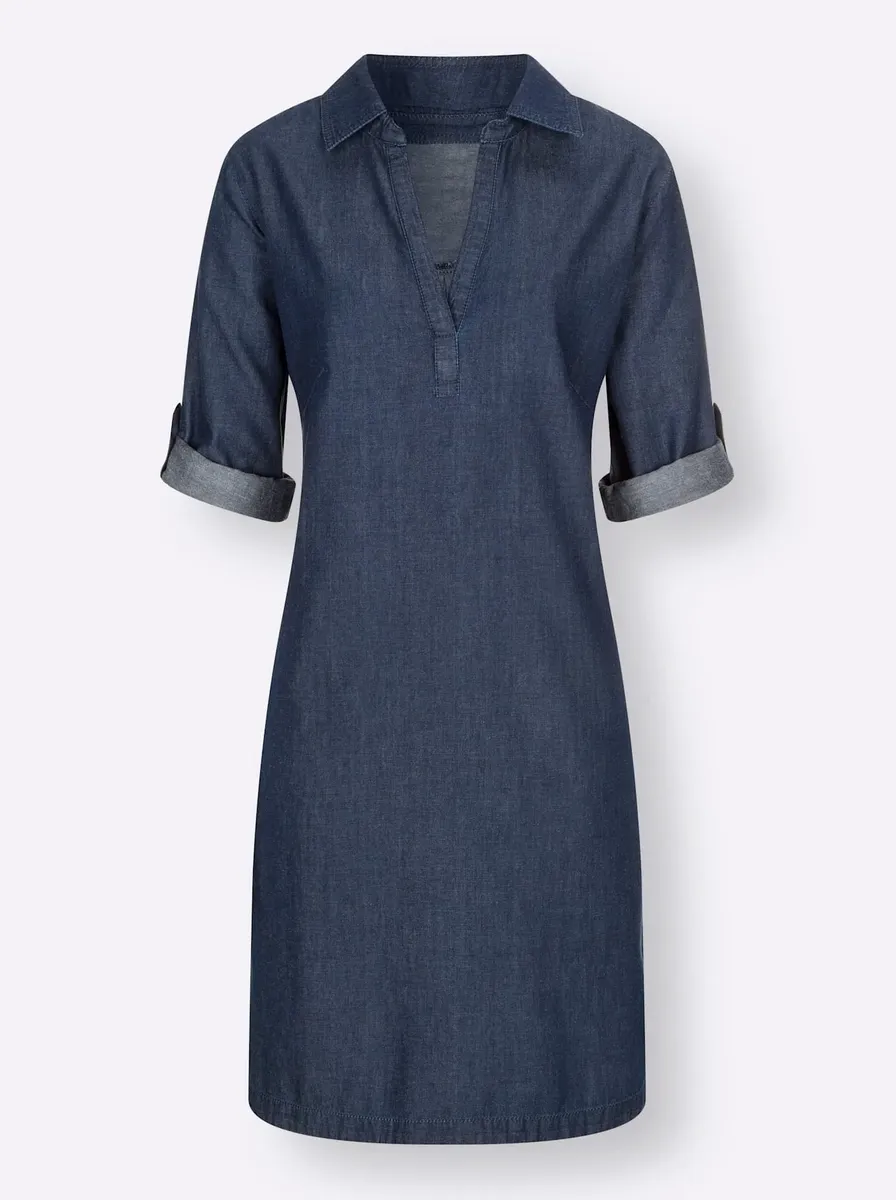 Джинсовое платье в стиле casual и спортивного шика. Модель без застежек с рубашечным воротником, вытачками на груди и V-образным вырезом. Рукава длиной 3/4 также можно подвернуть и закрепить перекладиной и разрезом. Слегка закругленные боковые разрезы. Складка сзади обеспечивает большую ширину. 100% хлопок. Машинная стирка.