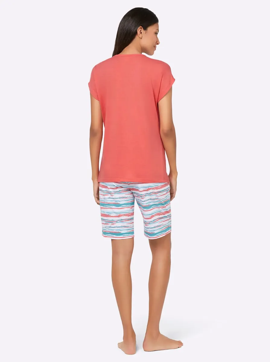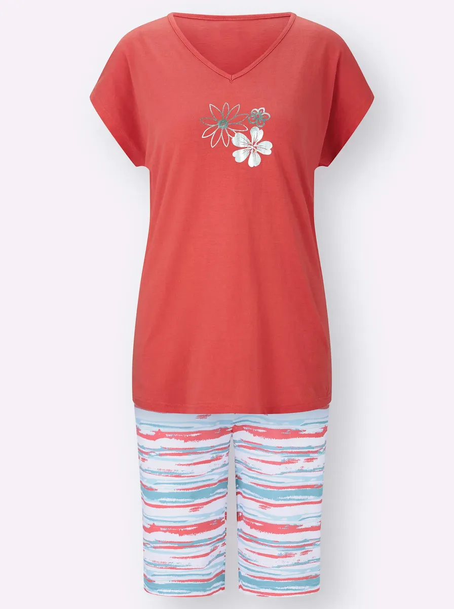 Идеально подходит для приятных ночей! Спортивные шорты в двух великолепных дизайнах. Выбирайте между прохладными полосками и мерцающими цветочными узорами. С V-образным вырезом на окантовке и заниженной линией плеч. Короткие брюки с заниженной талией. Модель из воздушного трикотажа. 100% хлопок.