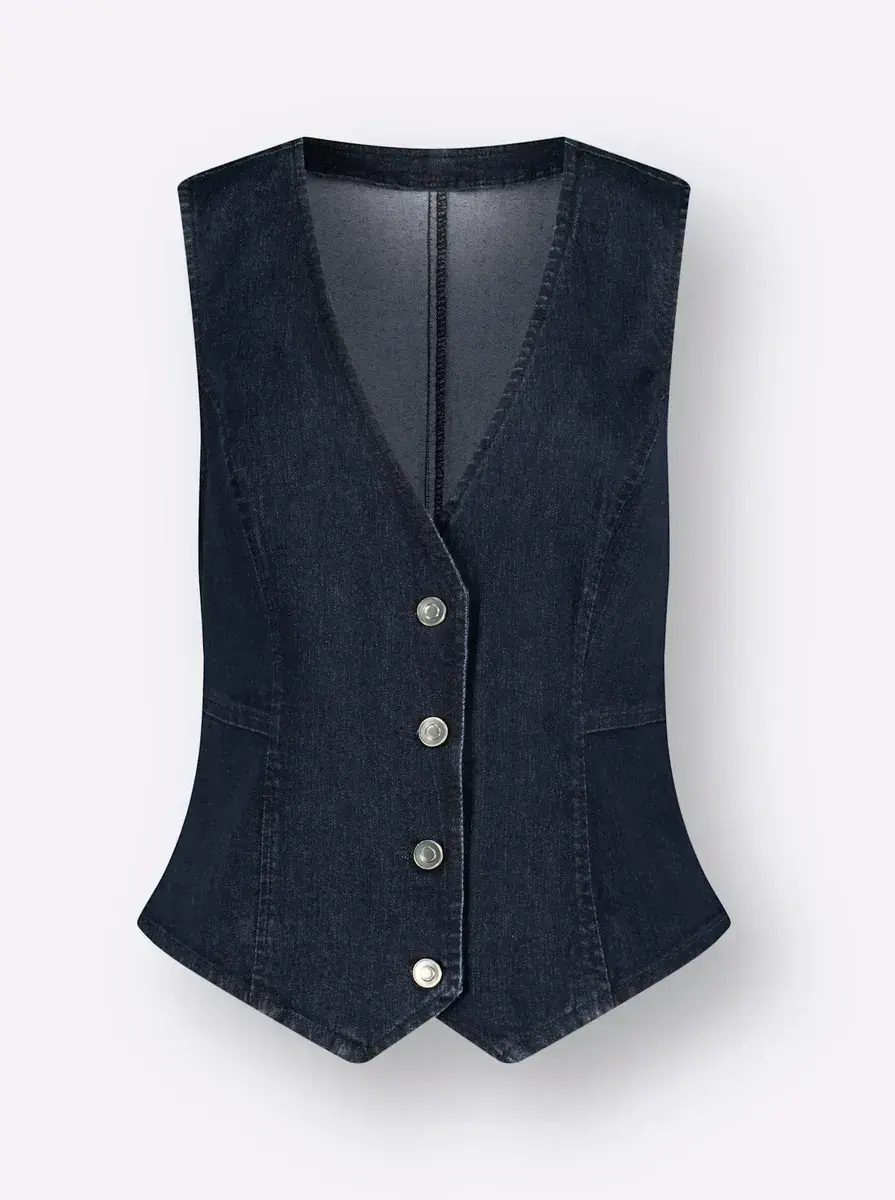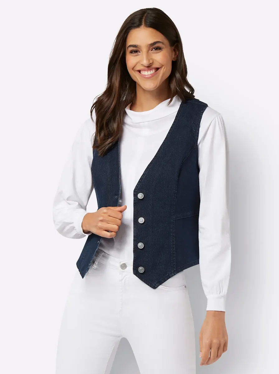 Комбинированный прочный джинсовый жилет удобного эластичного качества. С V-образным вырезом и 4 декоративными пуговицами. Формирование венских швов, слегка приталенный крой и разделительный шов сзади для идеальной посадки. Зауженный край спереди. 81% хлопок, 17% полиэстер, 2% эластан. Машинная стирка.