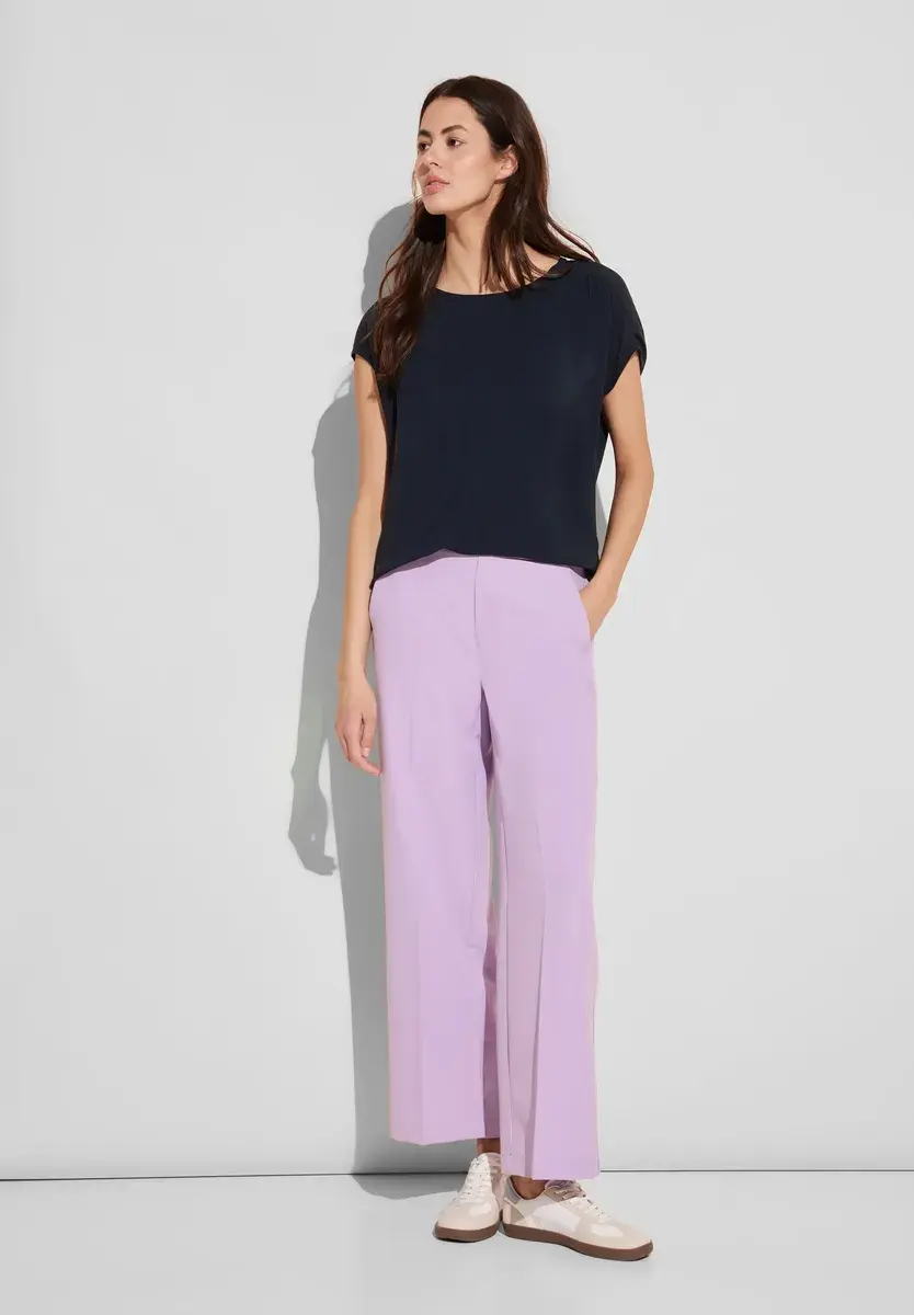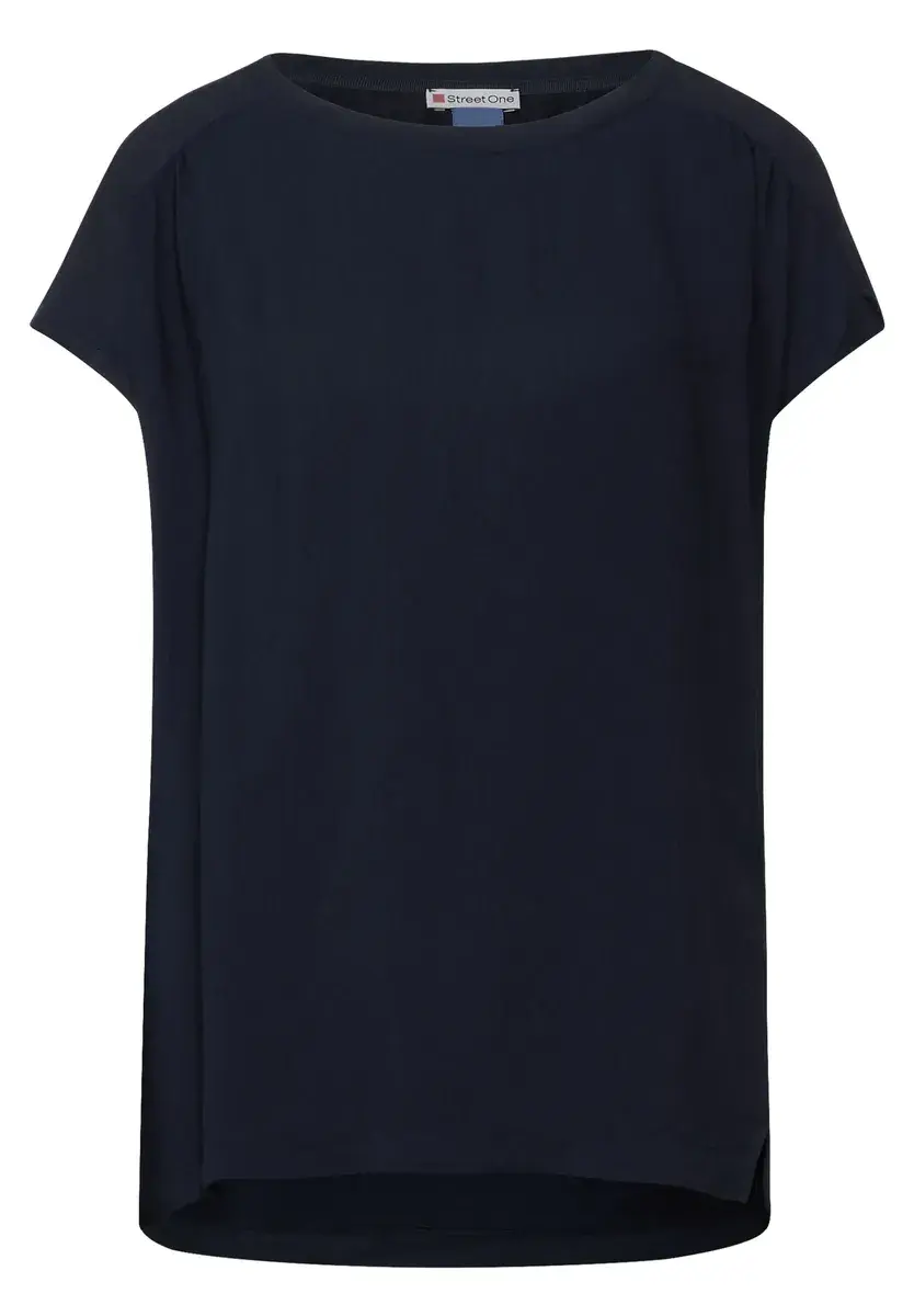 Комбинированный прочный женский топ-рубашка от STREET ONE. С прикрывающим бедра и нормальной шириной кроем. Рукава короткие. Верх из крепа ощущается прохладным на коже.