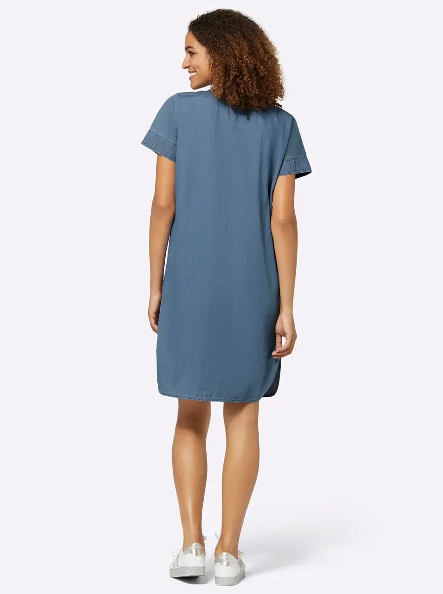 Идеально подходит для фигуры: платье в современном джинсовом стиле. V-образный вырез усилен широкой тесьмой с красивой окантовкой. Благодаря складкам снизу ткань приятно свободно ниспадает по фигуре. Закругленный низ с разрезами по бокам. 100% хлопок. Машинная стирка.