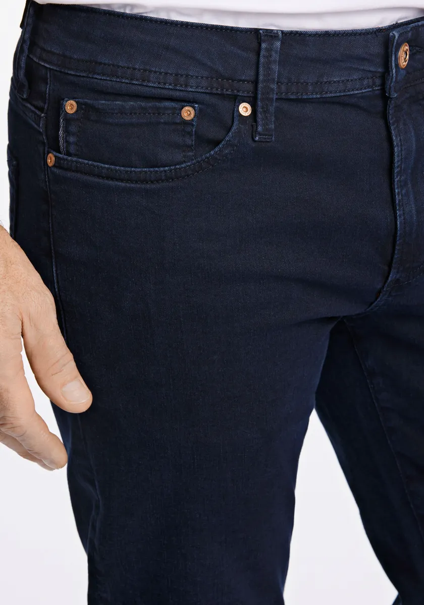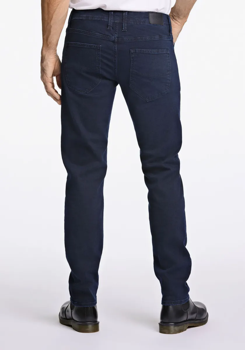Джинсы Bison темного цвета, но без выцветания, так что темный образ находится на переднем плане. Мягкий и удобный эластичный материал, который помогает сохранять форму джинсов. Джинсы имеют зауженную посадку, т.е. они свободны на бедрах и заужены на ногах. Состав материала: Верхняя ткань: 92% хлопок, 6% полиэстер, 2% эластан. Состав отто: Верхняя ткань: 92% хлопок, 6% полиэстер. , 2% эластан