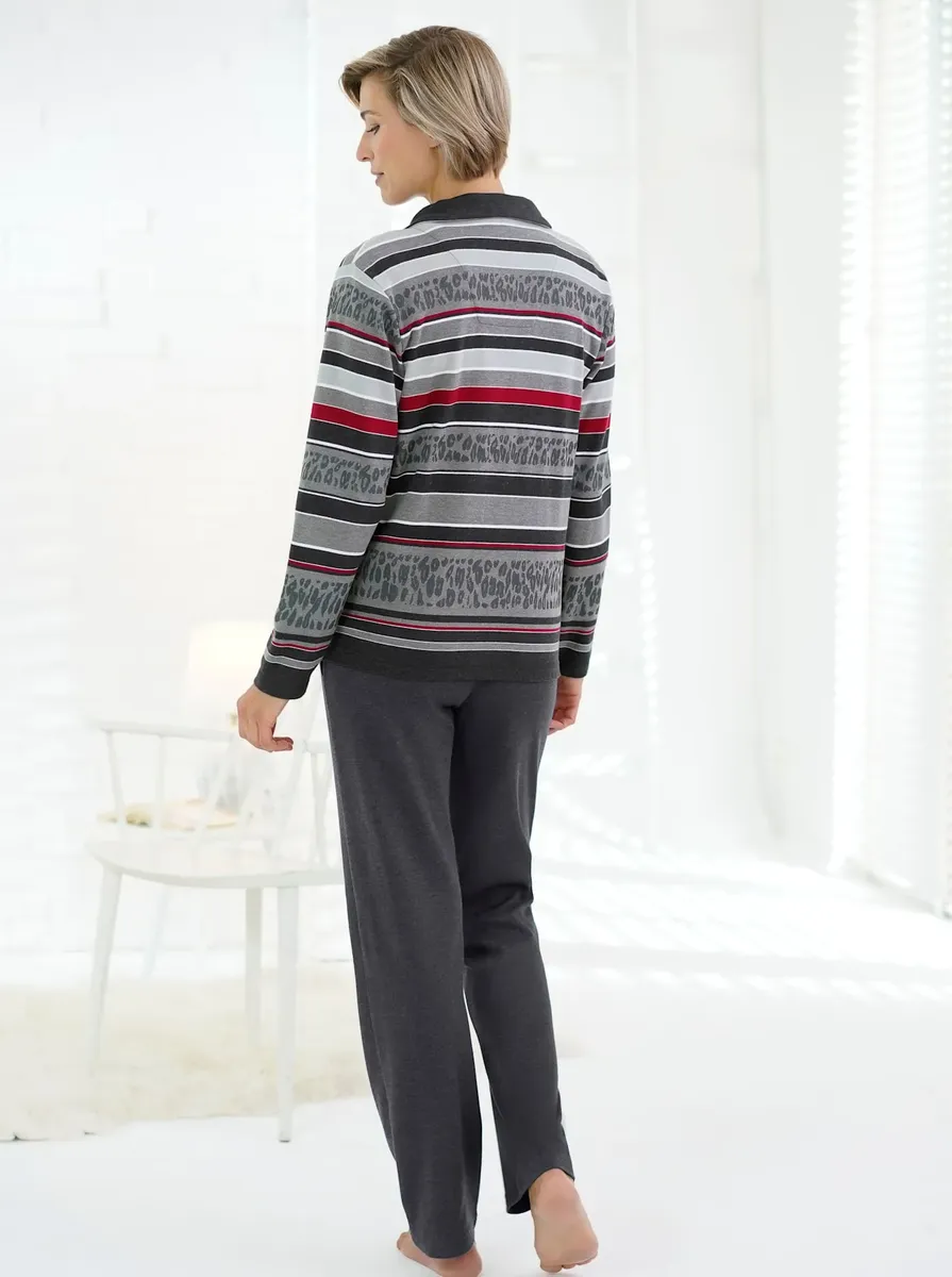 Идеально подходит для хорошего самочувствия, отдыха или хорошего самочувствия: костюм для отдыха Hajo красивого цветового контраста. Модный топ в полосатом исполнении. Воротник отложной на кулиске, молния во всю длину, 2 кармана. Брюки с эластичным поясом и 2 карманами. Стабильность размеров, качество блокировки. С содержанием микрофибры. 62% хлопок, 38% полиэстер. Машинная стирка.