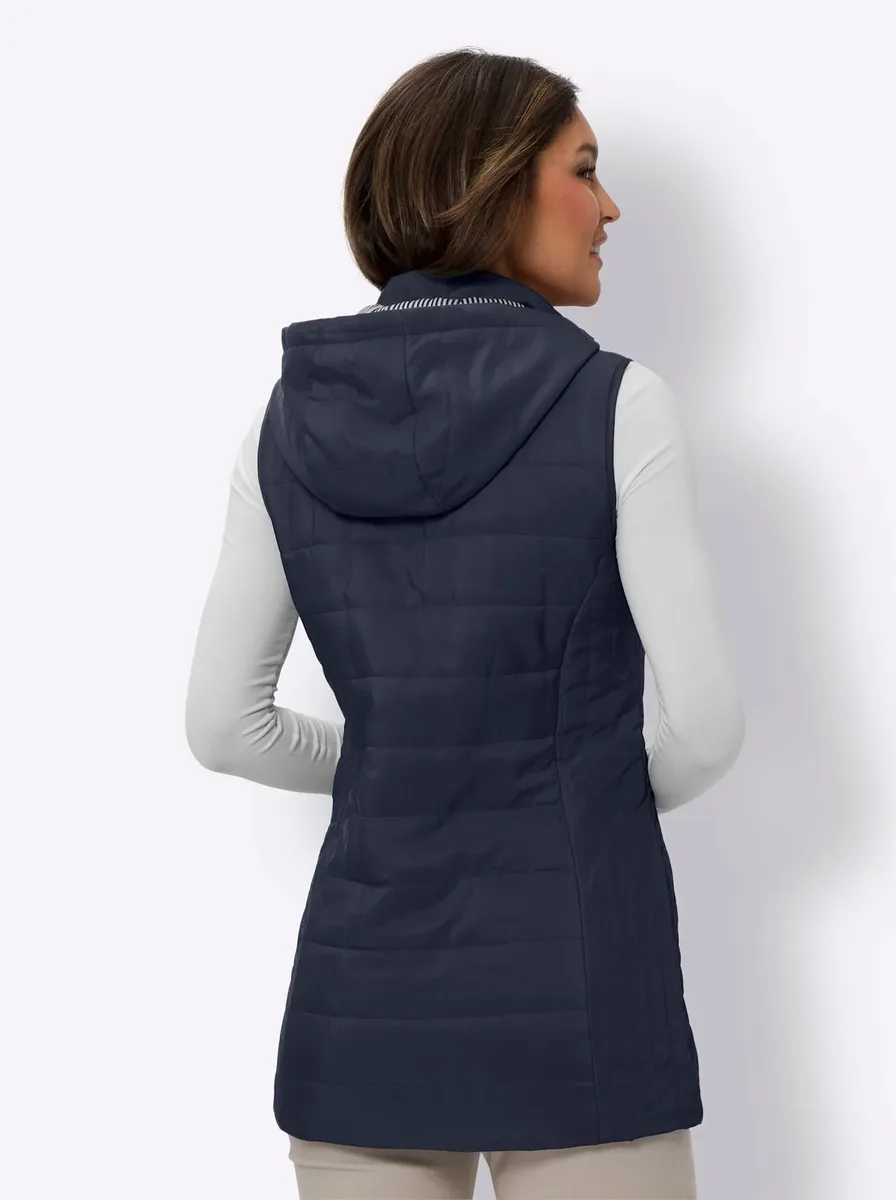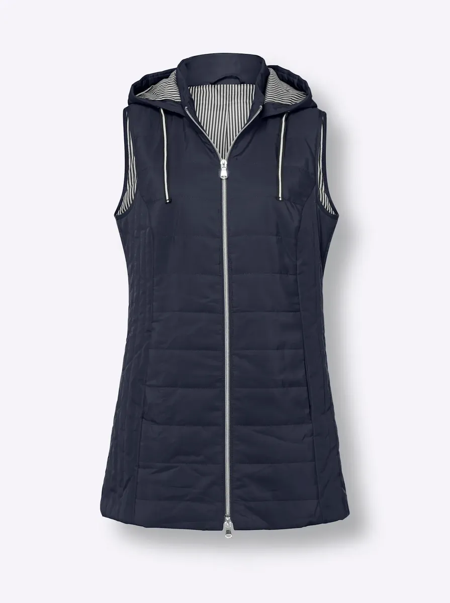 Комбинированный прочный стеганый жилет на подкладке в спортивную полоску. Фиксированный капюшон с люверсами и завязками. Практичная двусторонняя молния и формирующие венские швы спереди и сзади. 2 кармана. 100% полиэстер. Подкладка: 100% полиэстер. Машинная стирка.