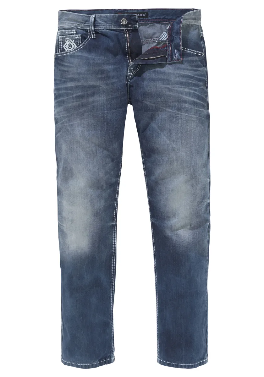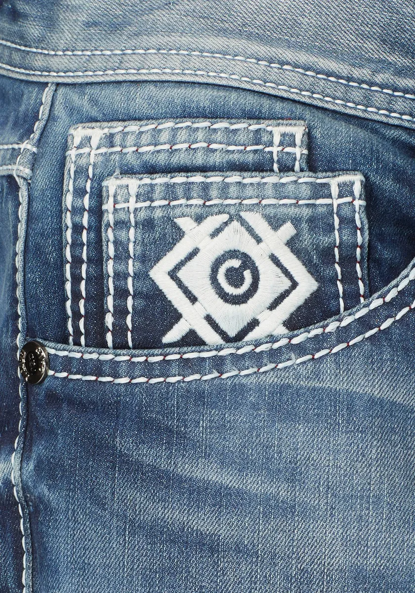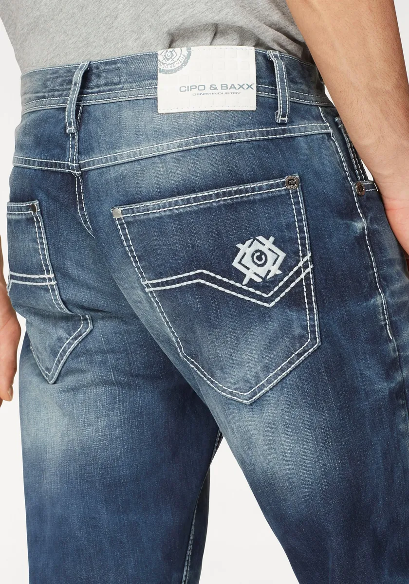 Джинсы Cipo & Baxx экстравагантного фасона с шестью карманами. В модном б/у виде. Круто: толстые контрастные швы и яркая вышивка на кармане для монет и заднем кармане. Классическая модель с застежкой-молнией и пуговицами. Ножки прямые и удобного кроя, высота талии невысокая. Широкая свободная посадка для оптимального комфорта. Приятное качество.