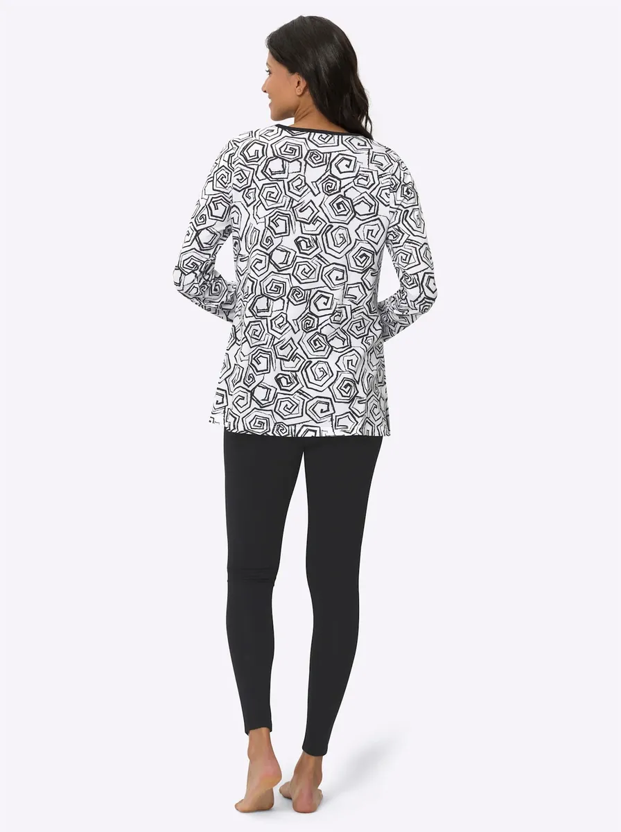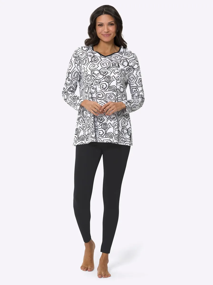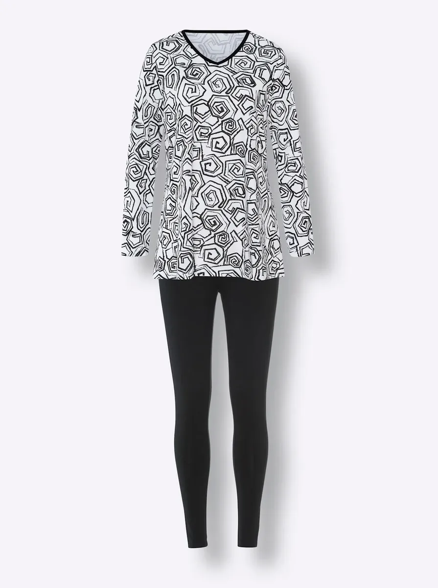 Идеально подчеркивающая фигуру пижама с игривым узорчатым верхом слегка расклешенного А-силуэта. Простые леггинсы узкие, с эластичным поясом по всему периметру для создания выигрышных пропорций. Поддержите инициативу «Хлопок, сделанный в Африке». Рубашка: 100% хлопок. Леггинсы: 95% хлопок, 5% эластан. Машинная стирка.