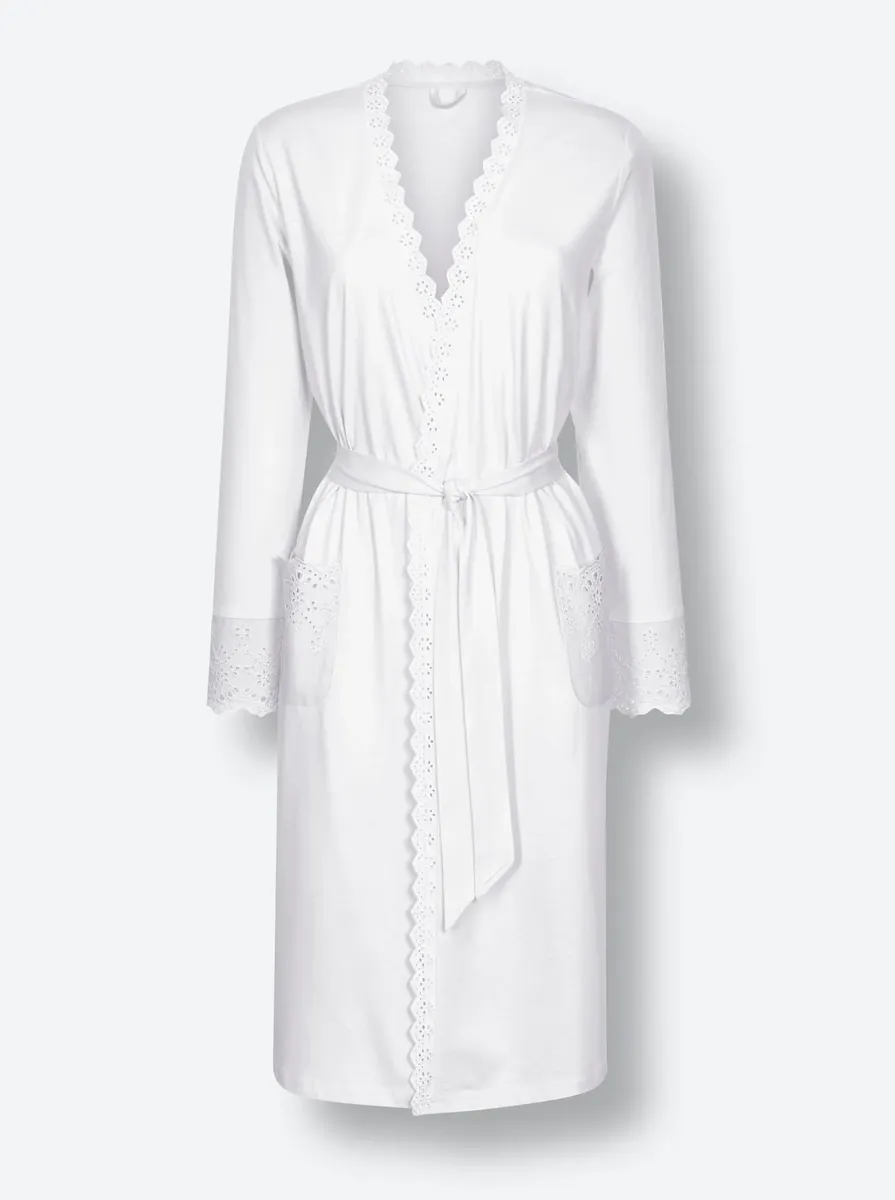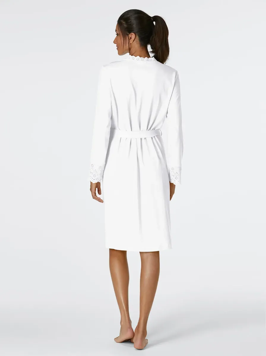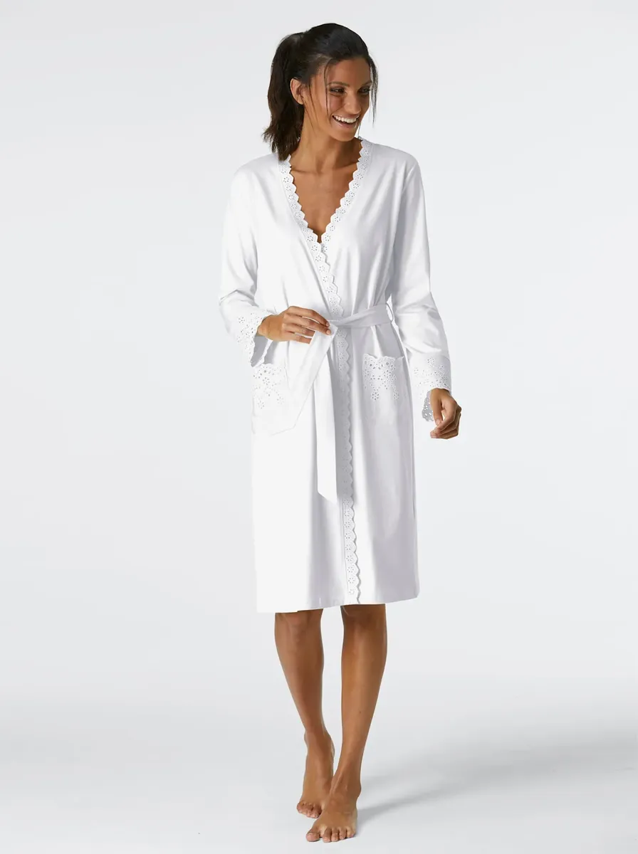 В светлом рубашечном качестве: халат от Feel Good. Форма кимоно с прикрепленной окантовкой по вырезу и вырезу. Декоративная деталь: кружево Бродери на манжетах и ​​2 накладных карманах. С поясом и внутренними завязками. Одинарный трикотаж. 100% хлопок.