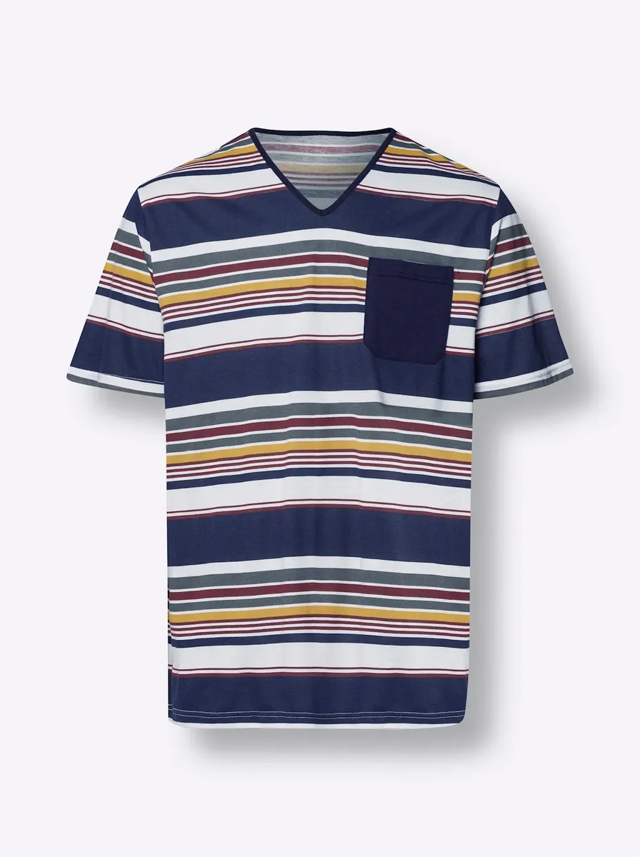 В спортивном полосатом исполнении: пижамная рубашка с V-образным вырезом по канту, короткими рукавами и 1 накладным нагрудным карманом. Одинарный трикотаж. 100% хлопок. Машинная стирка.