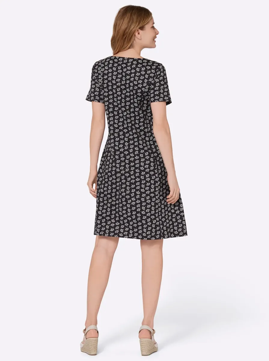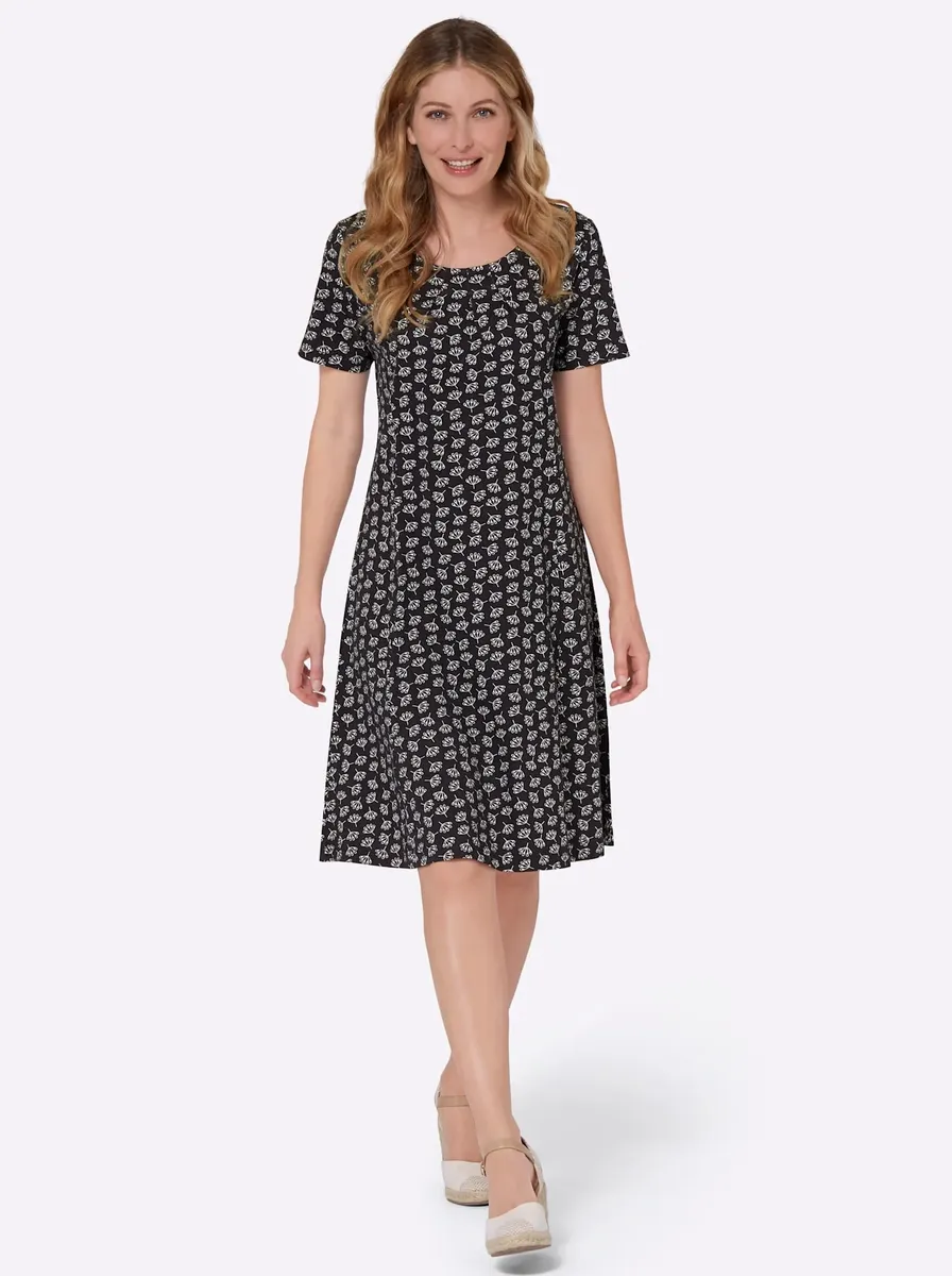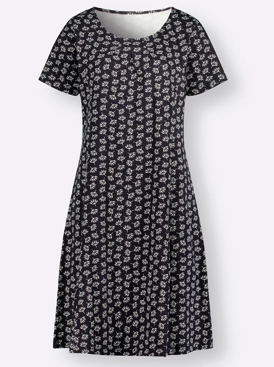 Компаньон для хорошего самочувствия с гарантией комплимента: трикотажное платье с цветочным узором из стабильного по размеру, гладкого качества из приятного для кожи хлопка пима. Складки вниз на круглом вырезе, формирующие разделительные швы и расклешенная форма создают привлекательный силуэт. 100% хлопок. Машинная стирка.