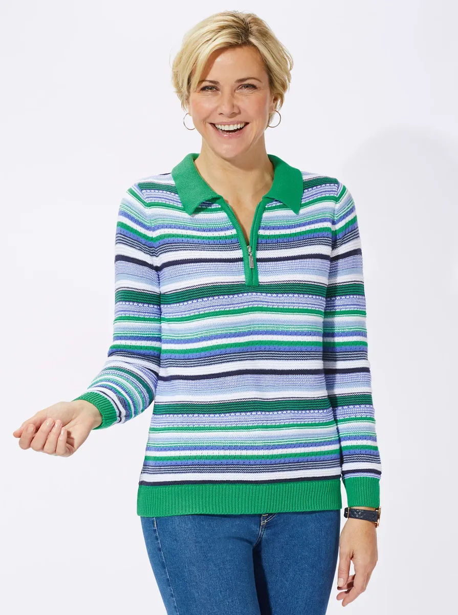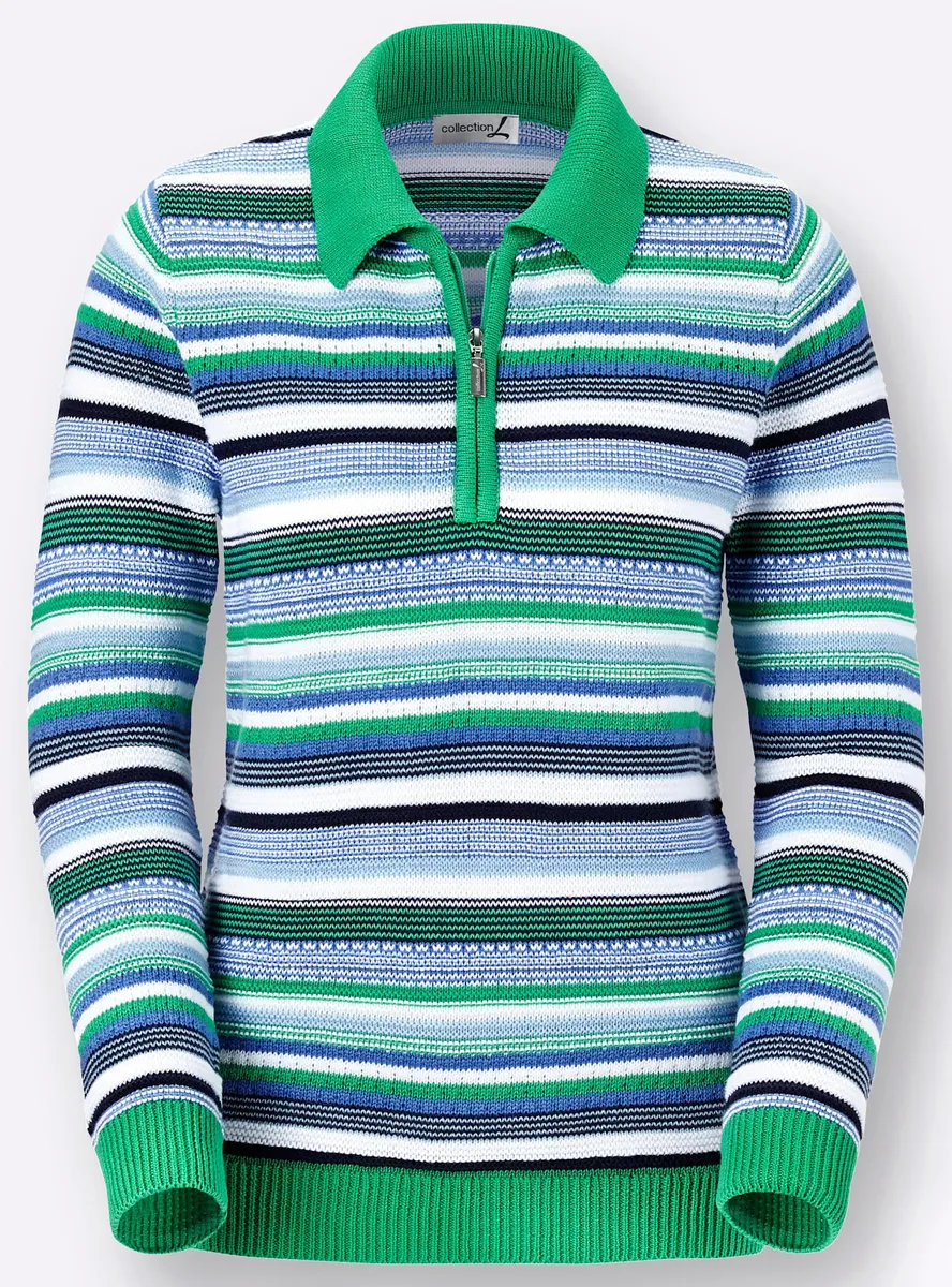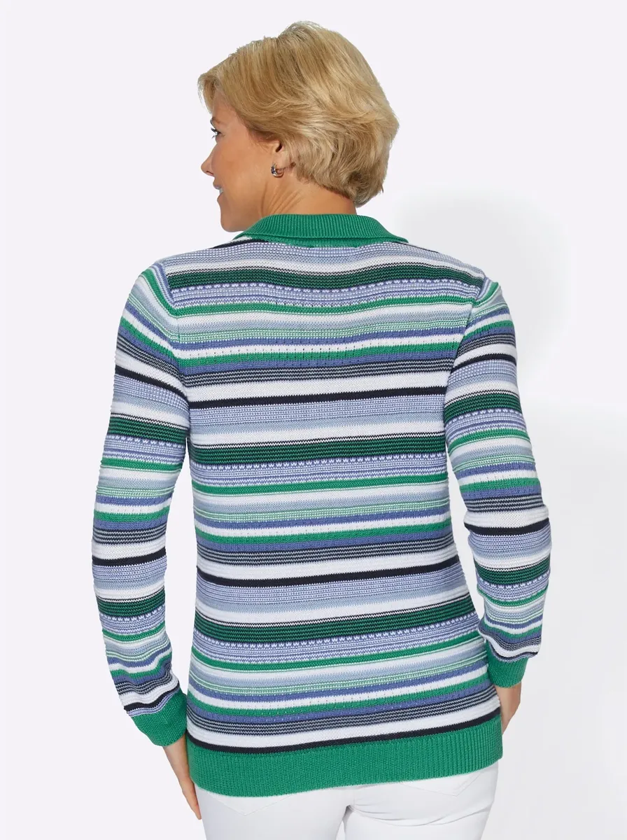 Этот полосатый свитер особенно красив благодаря своей структуре и сочетанию ажурных узоров! Воротник-поло на короткой молнии, ребристые манжеты с постоянно эластичной резиновой нитью. Тщательно связанная форма, соответствующая фигуре. 59% хлопок, 41% полиакрил. Машинная стирка.