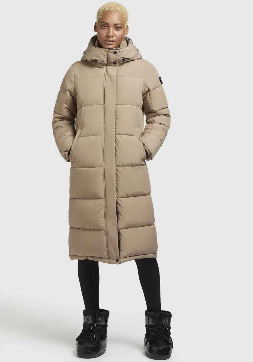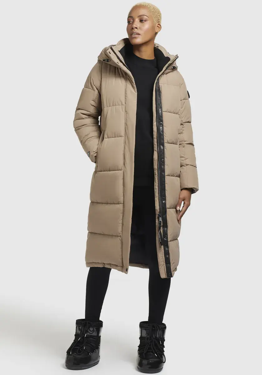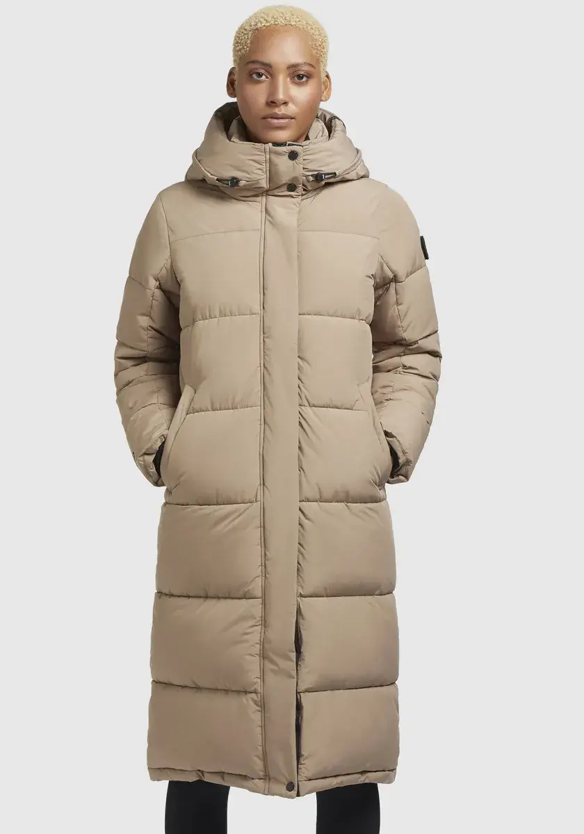 Длинный пуховик >>TIONE Благодаря теплому утеплителю, воротнику-стойке с флисовой вставкой, высокому капюшону и эластичным манжетам на подкладке рукавов пальто бросает вызов морозной зимней погоде. Двусторонняя молния с планкой на кнопках обеспечивает максимальную свободу движений в этом стеганом пальто длиной до колен. Согревающее и простое в уходе стеганое качество. На нашей модели (176 см, 89/61/91) размер S.