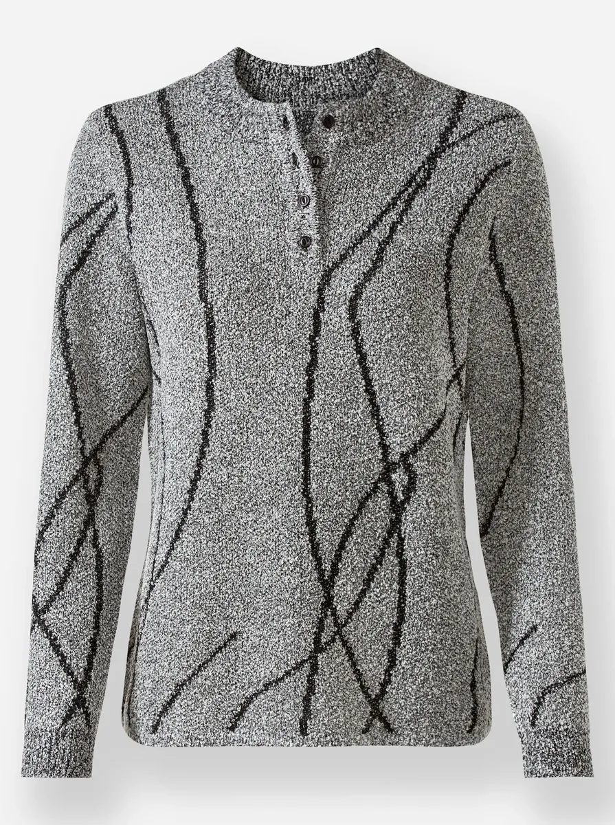 В стиле букле: мягкий, удобный свитер. Украшен контрастным узором интарсия. Воротник стойка, короткая планка на пуговицах, манжеты в рубчик. 75% полиакрил, 25% полиэстер. Машинная стирка.