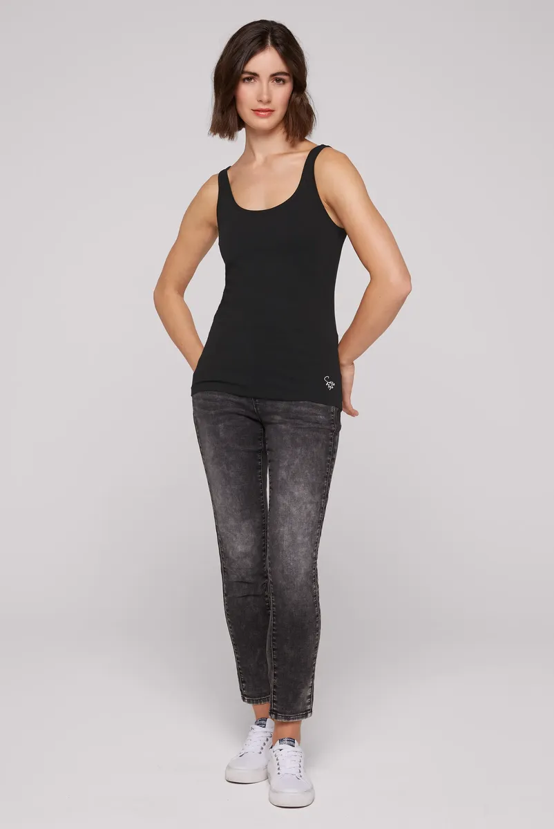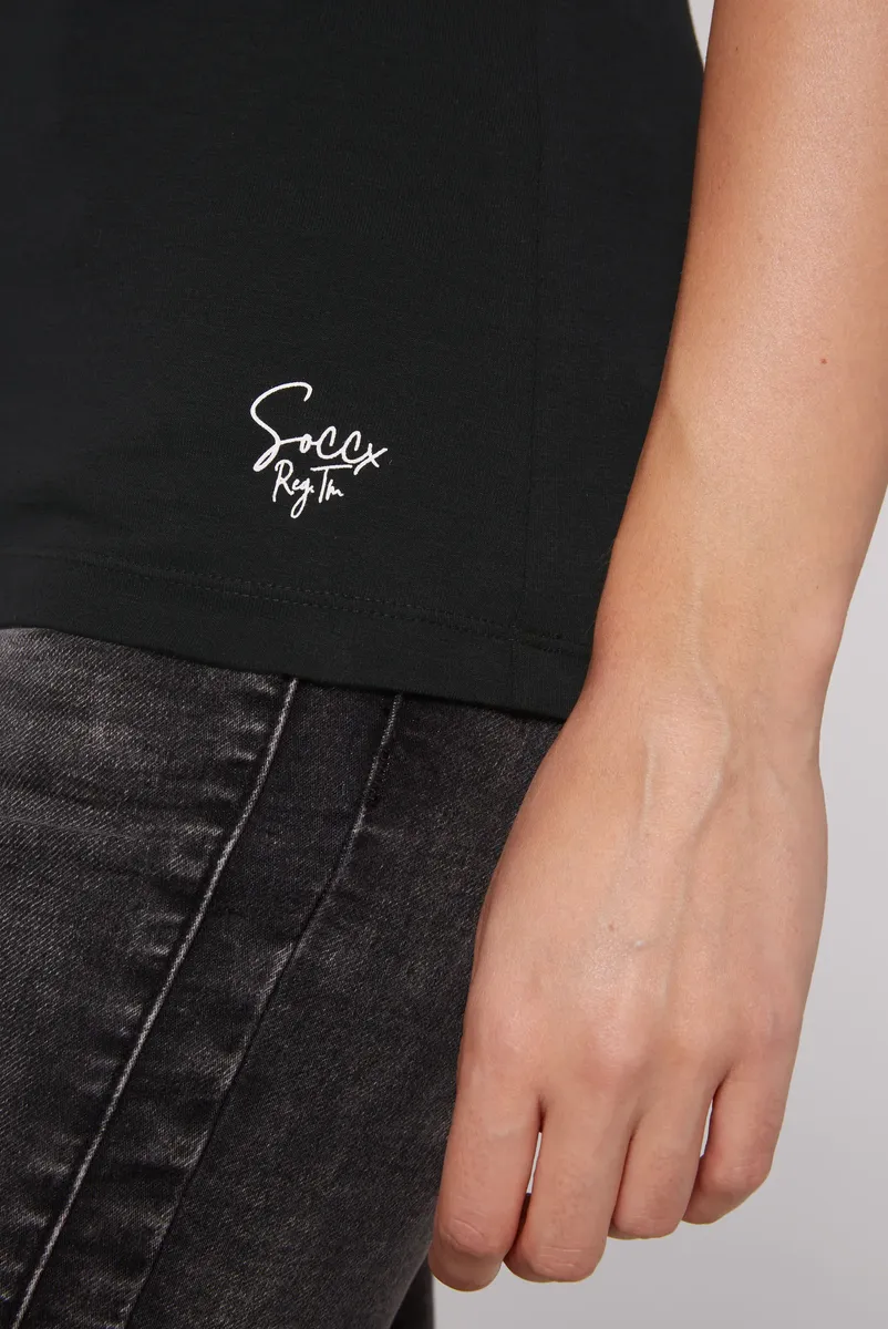 Этот простой топ актуален в высокий сезон и, если носить его отдельно, умело сочетается с шортами, джинсами и юбками. SOCCX отличается хорошей эластичностью верха и мини-принтом с логотипом на подоле спереди. Также доступный в черном и синем темно-синем цвете, он станет незаменимым элементом женского гардероба! Рост модели 176 см, размер соответствует. С.