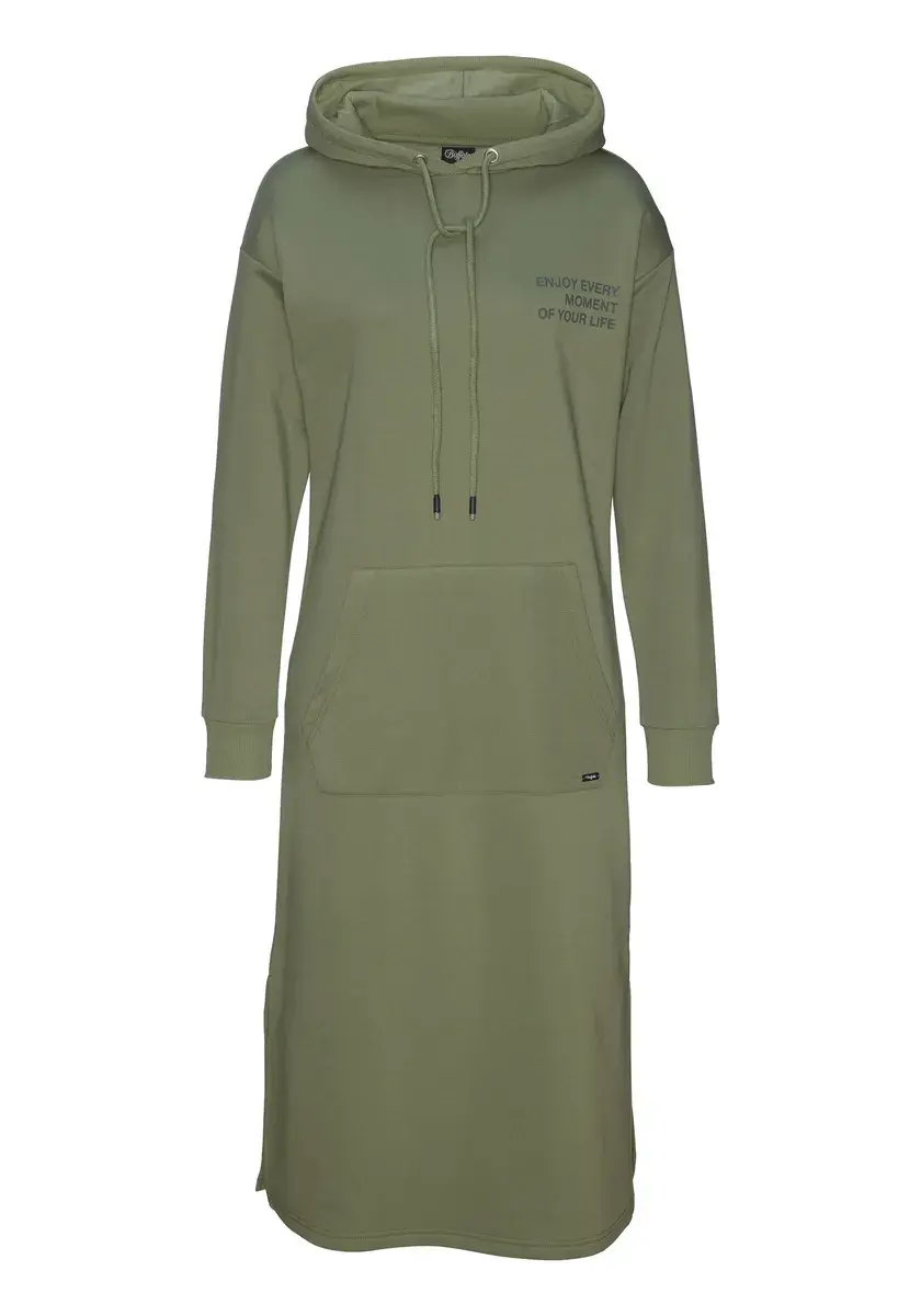Комфортное платье-толстовка с капюшоном от Buffalo. Длина миди. Надпись на груди. Заниженная линия плеча, ребристые манжеты и карман-кенгуру с небольшой эмблемой. Разрезы по бокам. Для отдыха. Мягкий френч терри.