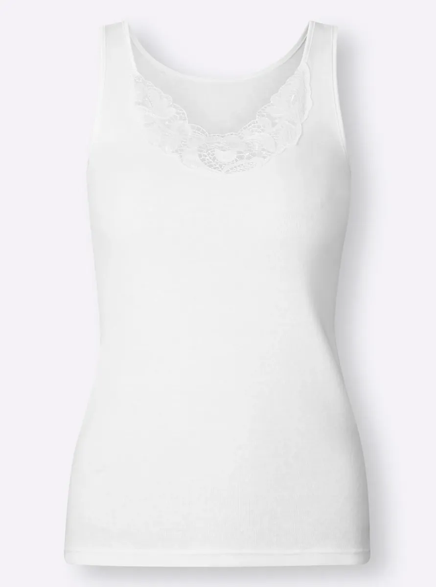 Изготовлено из высококачественного сертифицированного органического хлопка: рубашка подмышками из васпура с эффектным кружевным мотивом и элегантной атласной окантовкой вдоль V-образного выреза. Без боковых швов. Прекрасное качество ребер. Сертифицированный продукт OCS. 100% хлопок.