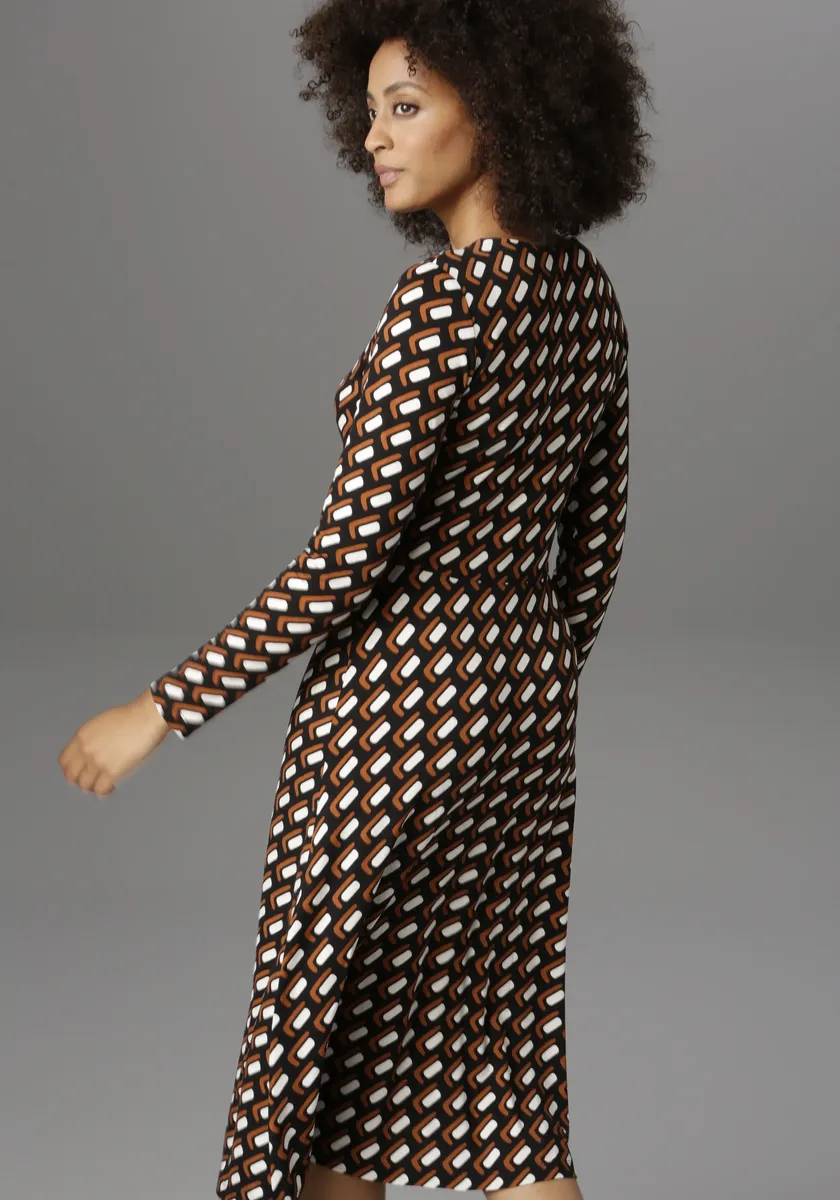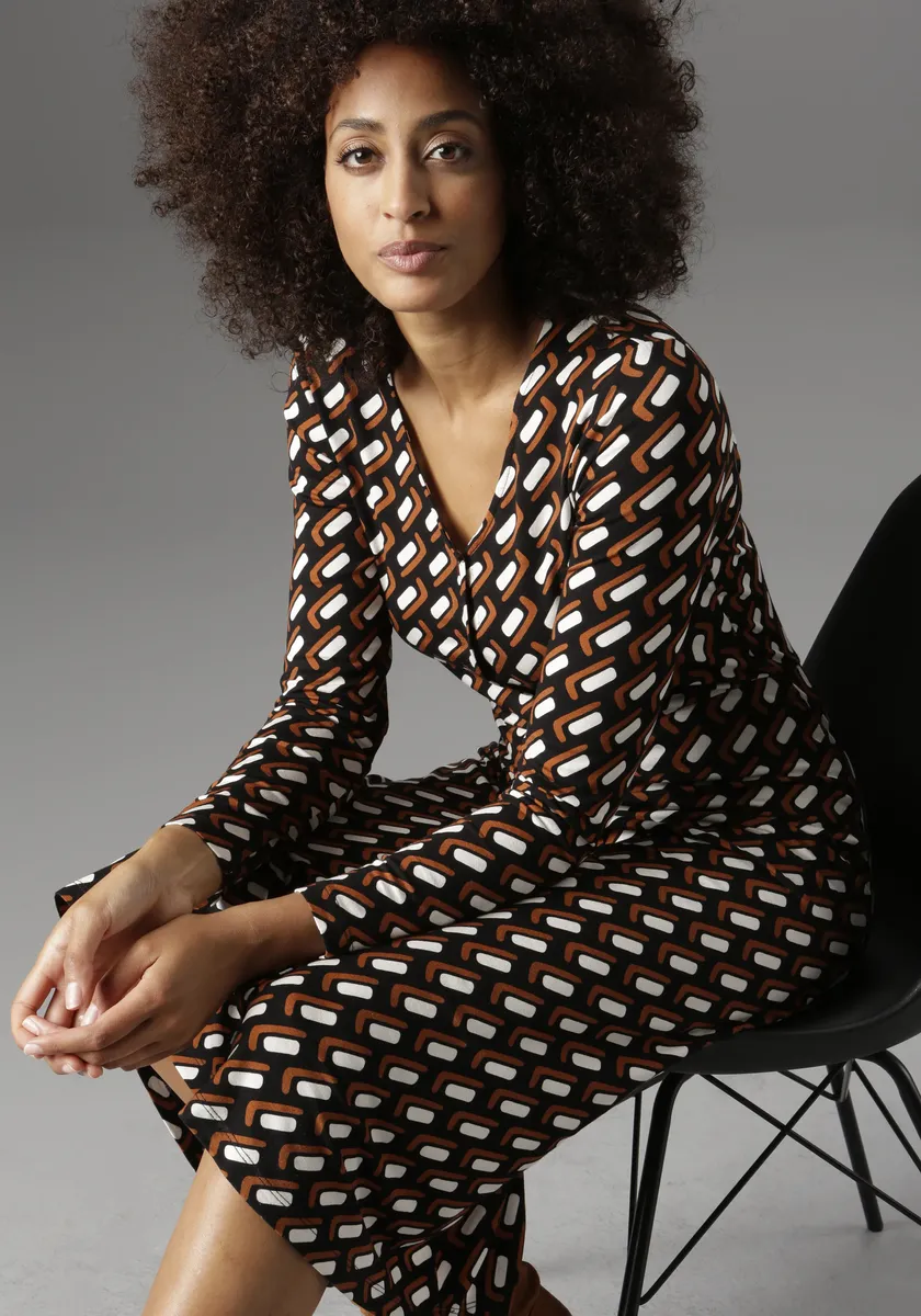 Изысканное трикотажное платье от Aniston Selected. С планкой на пуговицах. С красивым V-образным вырезом. Облегает фигуру. Машинная стирка.