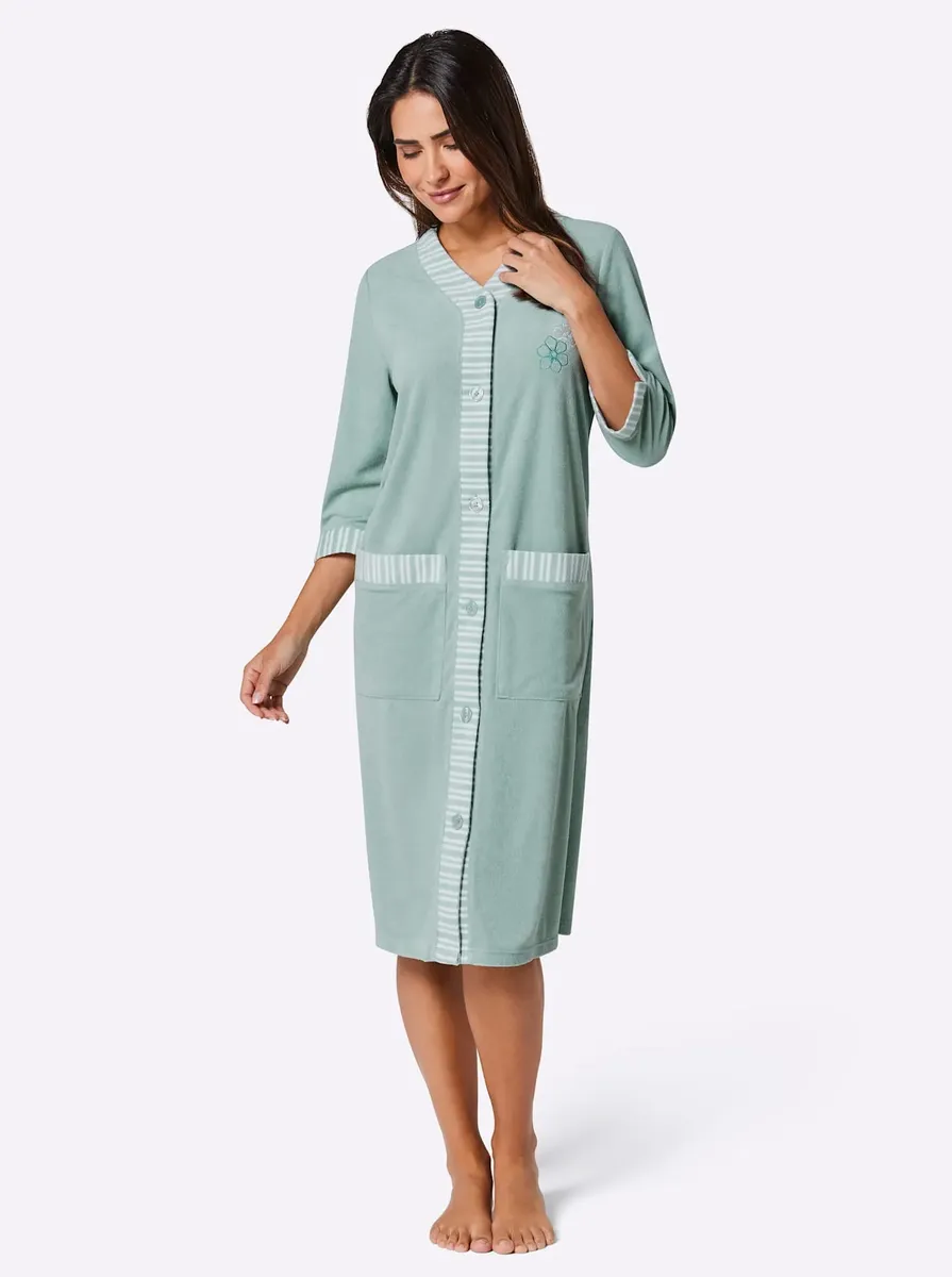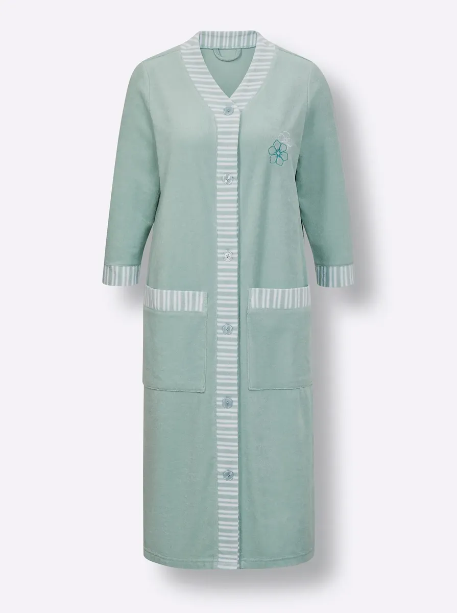 Контрастный халат из комфортной легкой махровой ткани. Декоративная вышивка на груди. С V-образным вырезом, планкой на пуговицах во всю длину и рукавами 3/4 с разрезом. 2 накладных кармана. Поддержите инициативу «Хлопок, сделанный в Африке». 80% хлопок, 20% полиэстер.