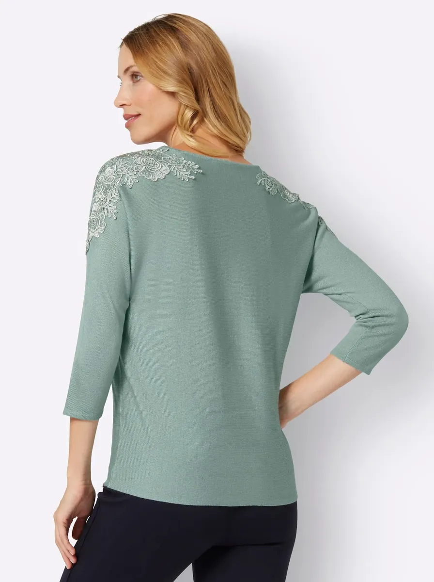 Изысканный свитер с гармоничным по цвету кружевом на плечах и рукавах «летучая мышь» длиной 3/4! 100% полиакрил. Кружево: 100% полиэстер. Машинная стирка.
