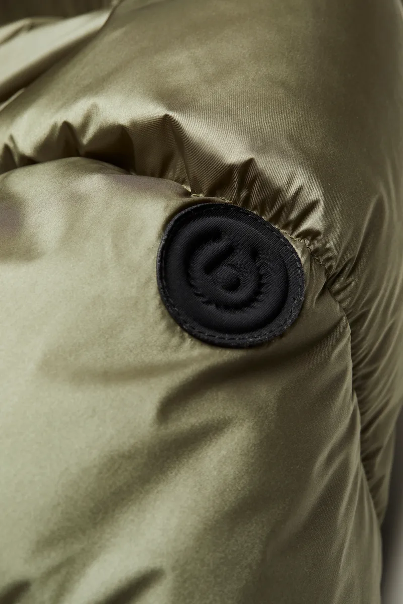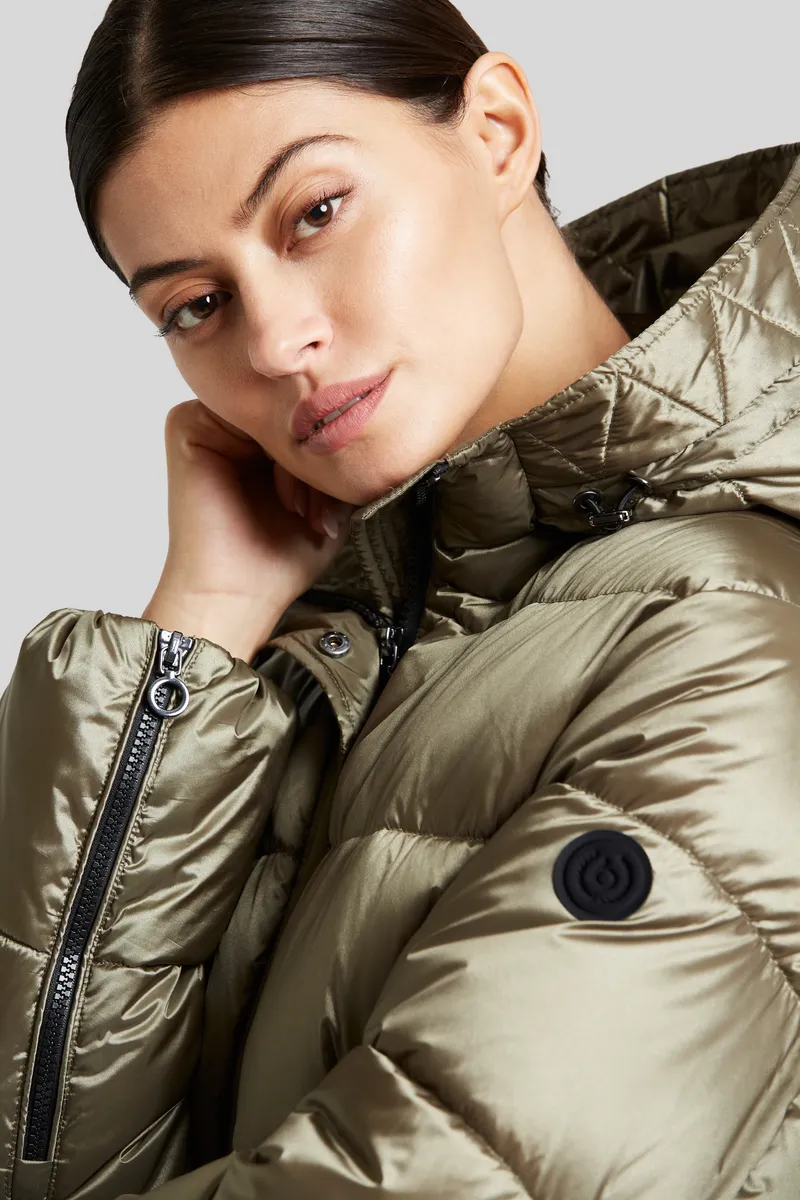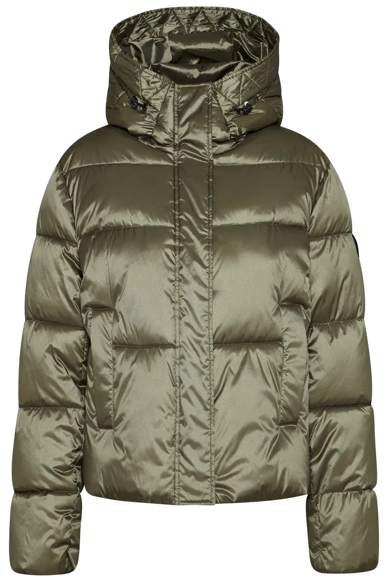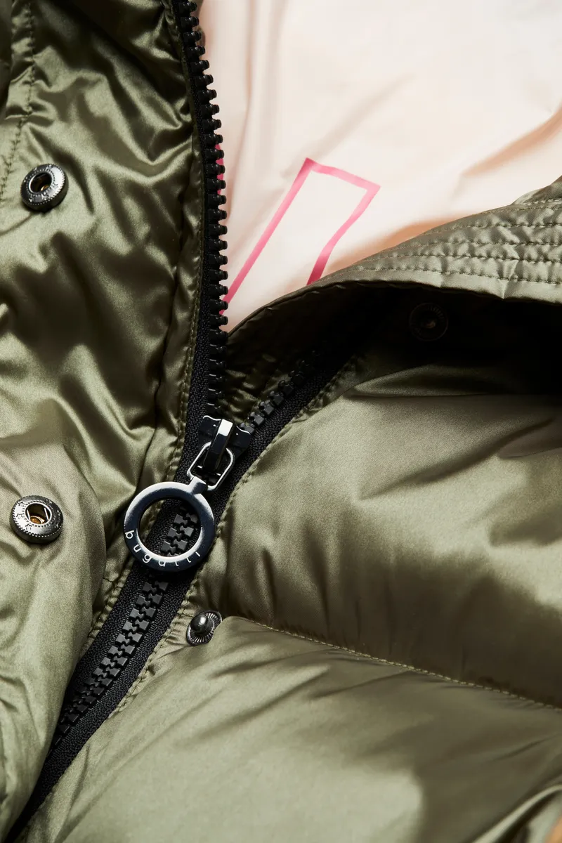 Короткая куртка оснащена кулиской по краю и большим капюшоном. Наполнитель Sorona обеспечивает идеальную теплоизоляцию. Это волокно основано на возобновляемом сырье и служит экологически безопасным и приятным легким наполнителем. Двусторонняя молния позволяет расстегивать куртку снизу. Детали интерьера расставляют цветовые акценты.