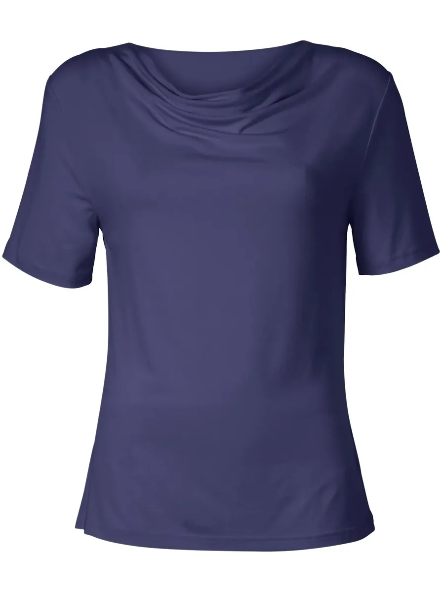 Изюминкой этой женственной рубашки является струящийся вырез-водопад. Втачные короткие рукава для идеальной посадки. Очень комфортная смесь вискозы-стрейч. 95% вискоза, 5% эластан. Машинная стирка.