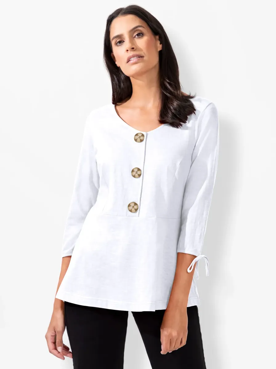 Изюминкой этой рубашки, выполненной из качественной пряжи, являются большие декоративные пуговицы в виде рога. Рукава 3/4 с завязками на конце. Привлекательная расклешенная форма с разделительным швом спереди. 100% хлопок. Машинная стирка.