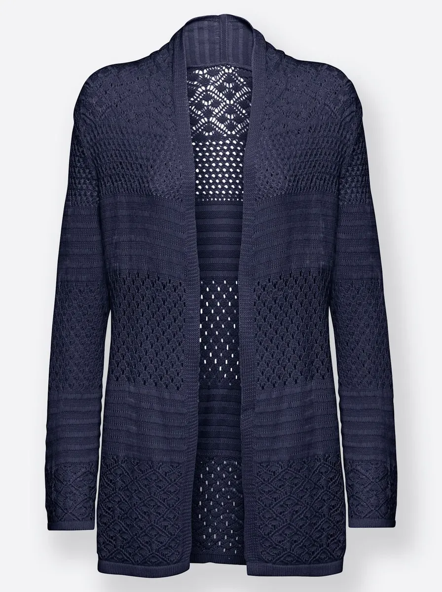 Дизайн: такой красивый. Качество: удивительно мягкое. Выкройка: такая лестная. Есть много причин приобрести этот кардиган! Кругом воздушный ажурный узор. Можно носить в повседневном расстегнутом виде с отложным воротником и складками на спине. 60% хлопок, 40% вискоза. Машинная стирка.