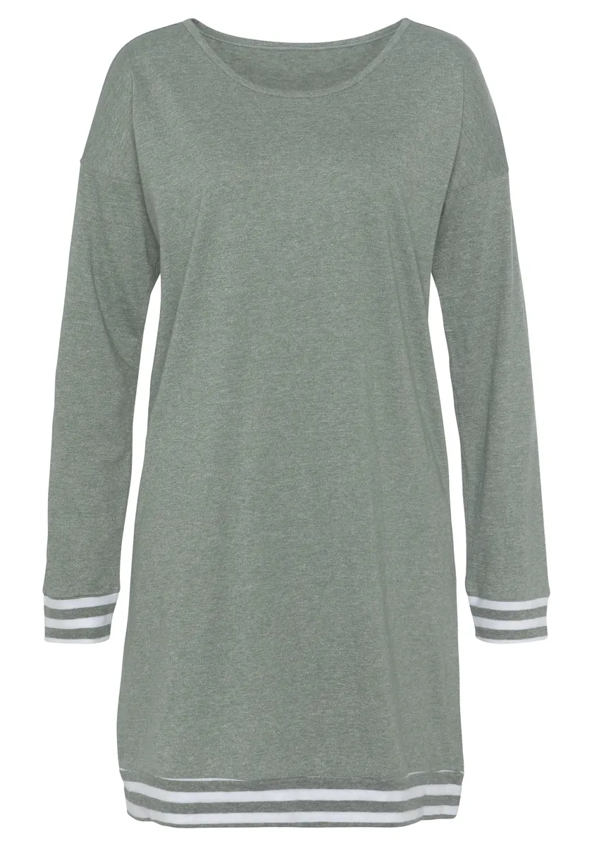 Короткая ночная сорочка от Vivance Dreams в меланжевом исполнении. Полосатые манжеты по низу, широкий круглый вырез. Заниженная линия плеча и длинные рукава. Удобная посадка. Легкий в уходе мягкий одинарный трикотаж из 50 % хлопка и 50 % полиэстера.