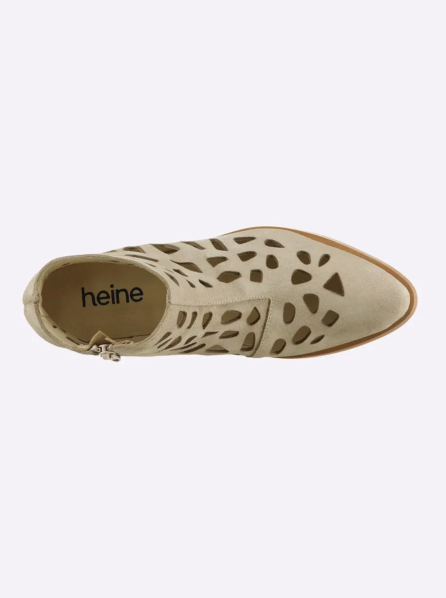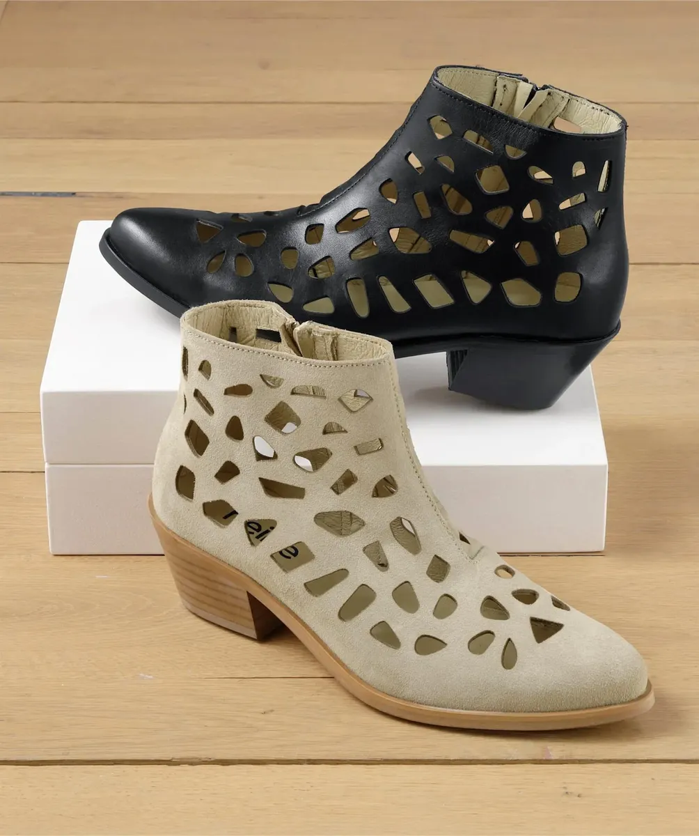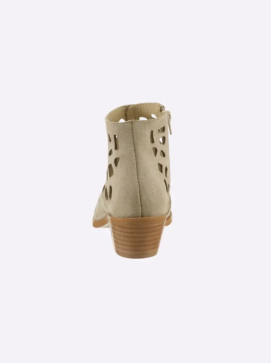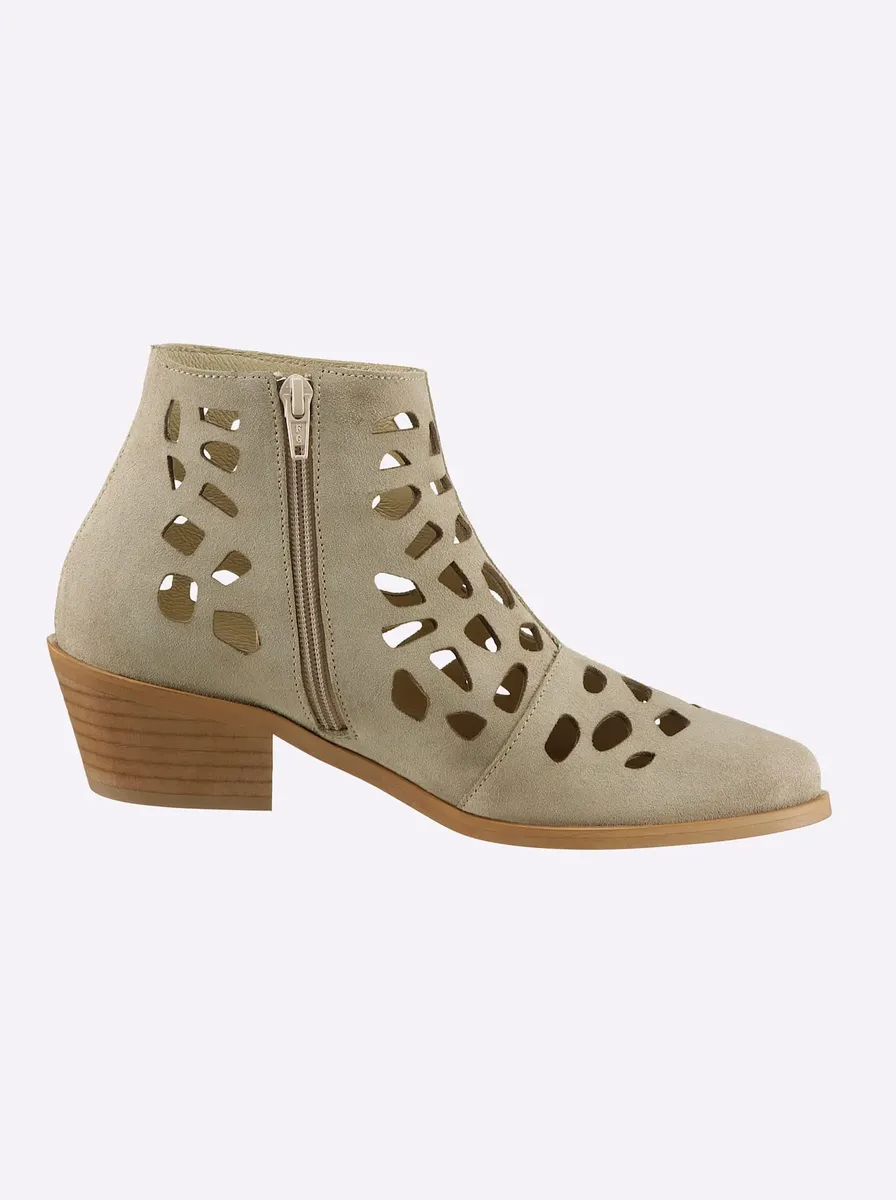 Короткие ботильоны из высококачественной воловьей замши с необычным узором, вырезанным лазером. Подкладка и стелька из кожи. С особенно мягкой подкладкой. Каблук ковбойский, высота ок. 40 мм.