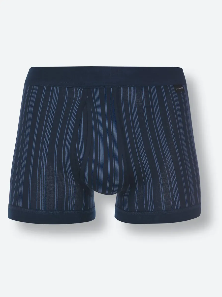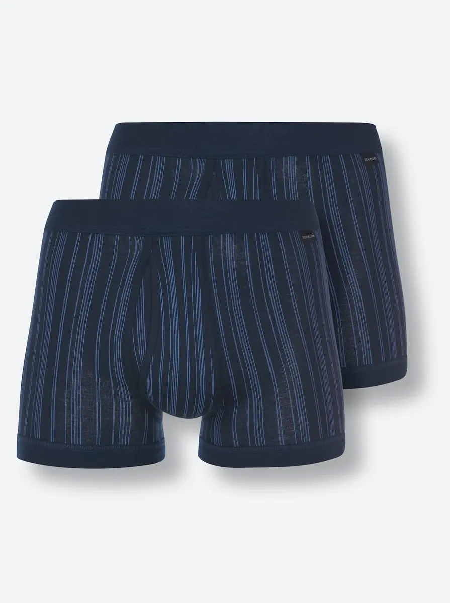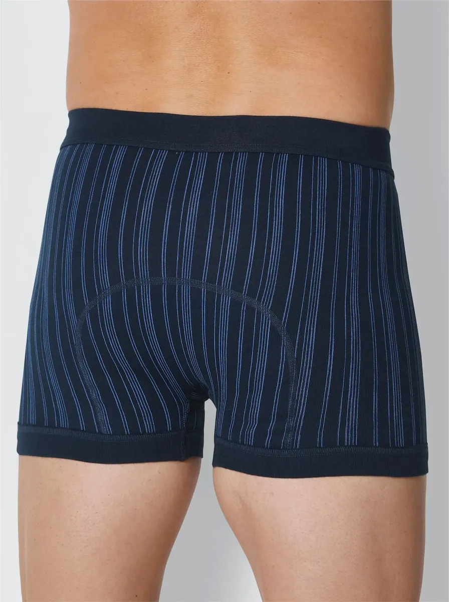 Короткие брюки от Schiesser в двойной упаковке со спортивным узором в полоску. Удобный мягкий пояс и ширинка. Нет раздражающих боковых швов, поэтому кожа ощущается особенно комфортно. Очень прочные ребра высокого качества. 100% хлопок.