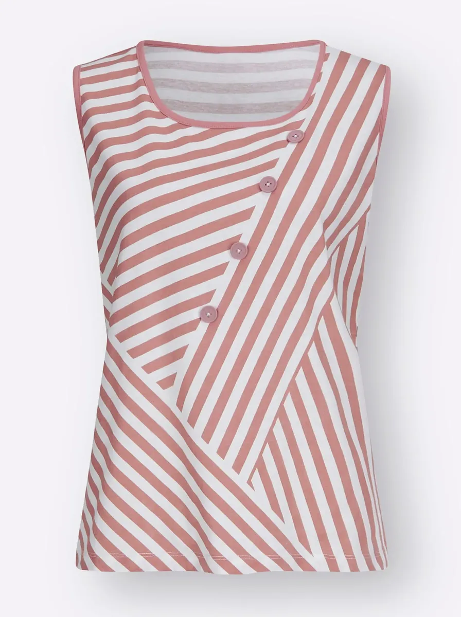 Этот топ-рубашка выполнен в привлекательных цветах и ​​имеет яркий полосатый дизайн! Спереди с декоративными декоративными пуговицами. 100% хлопок. Машинная стирка.