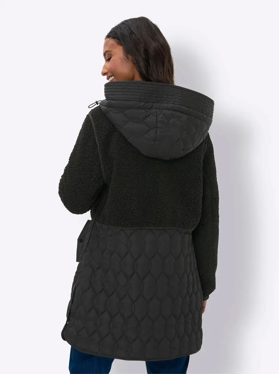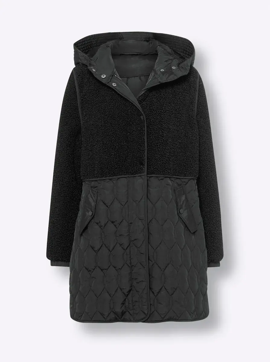 Длинная куртка. Красивая и теплая, из модного сочетания тедди и стеганого материала. С фиксированным капюшоном, длинными рукавами с эластичными манжетами и карманами с клапанами. Потайная молния с планкой на кнопках. Боковые разрезы на кнопках. 100% полиамид. Подкладка: 100% полиэстер. Машинная стирка.